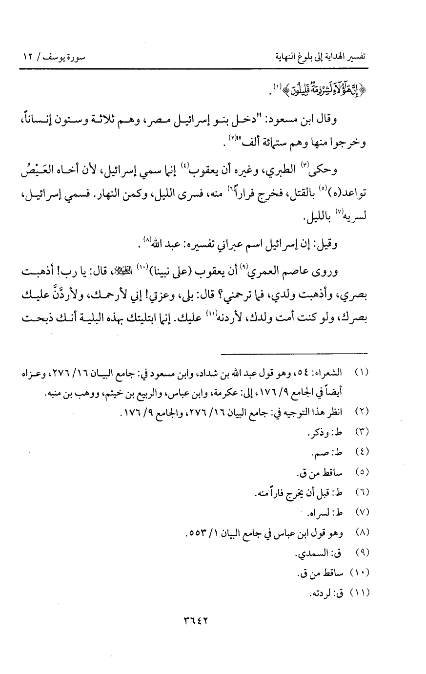 وحكى الطبري، وغيره أن يعقوب إنما سمي إسرائيل، لأن أخاه العَيْصُ تواعد (هـ) بالقتل، فخرج فراراً منه، فسرى الليل، وكمن النهار. فسمي إسرائيل، لسريه بالليل.