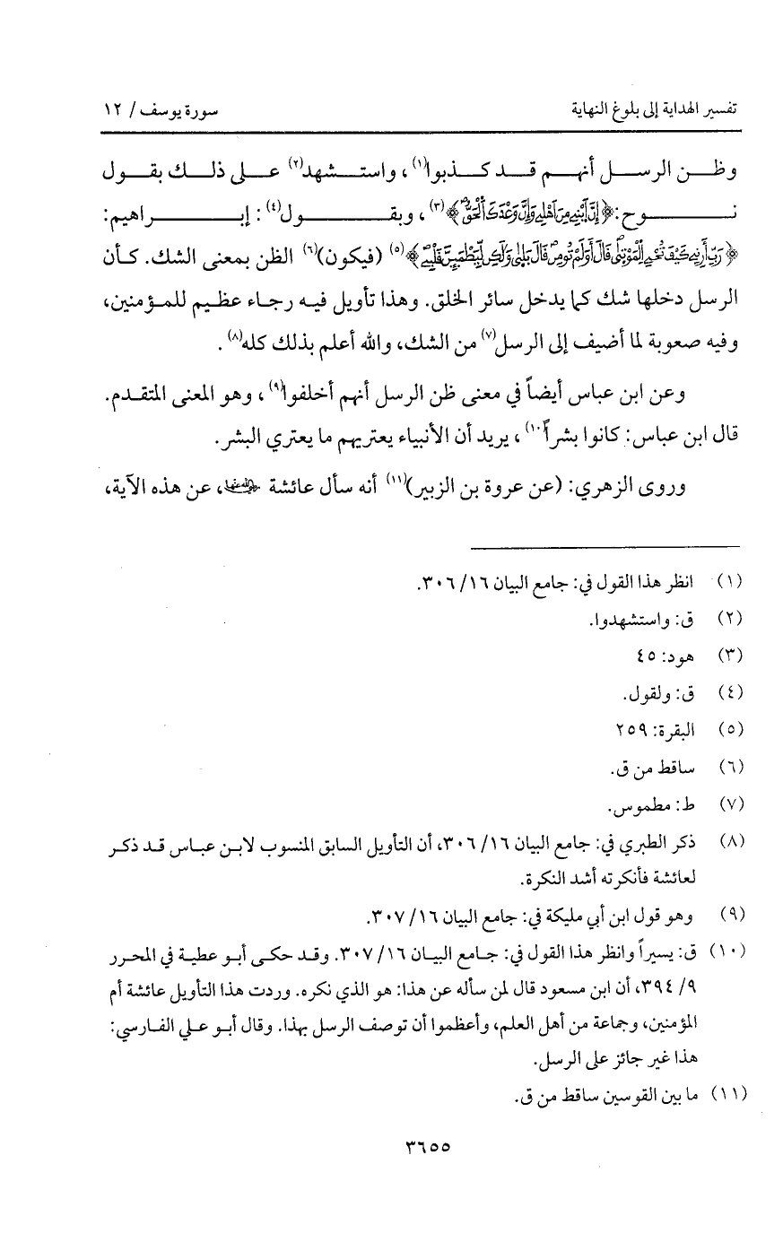 وظن الرسل أنهم قد كذبوا واستشهد على ذلك بقول نوح: {إِنَّ ابني مِنْ أَهْلِي وَإِنَّ وَعْدَكَ الحق} [هود: 45]، وبقول: إبراهيم، {رَبِّ أَرِنِي كَيْفَ تُحْيِي الموتى قَالَ أَوَلَمْ تُؤْمِن قَالَ بلى وَلَكِن لِّيَطْمَئِنَّ قَلْبِي} [البقرة: 260] (فيكون) الظن بمعنى الشك. كأن الرسل دخلها شك كما يدخل سائر الخلق. وهذا تأويل فيه رجاء عظيم للمؤمنين، وفيه صعوبة لما أضيف إلى الرسل من الشك، والله أعلم بذلك كله.