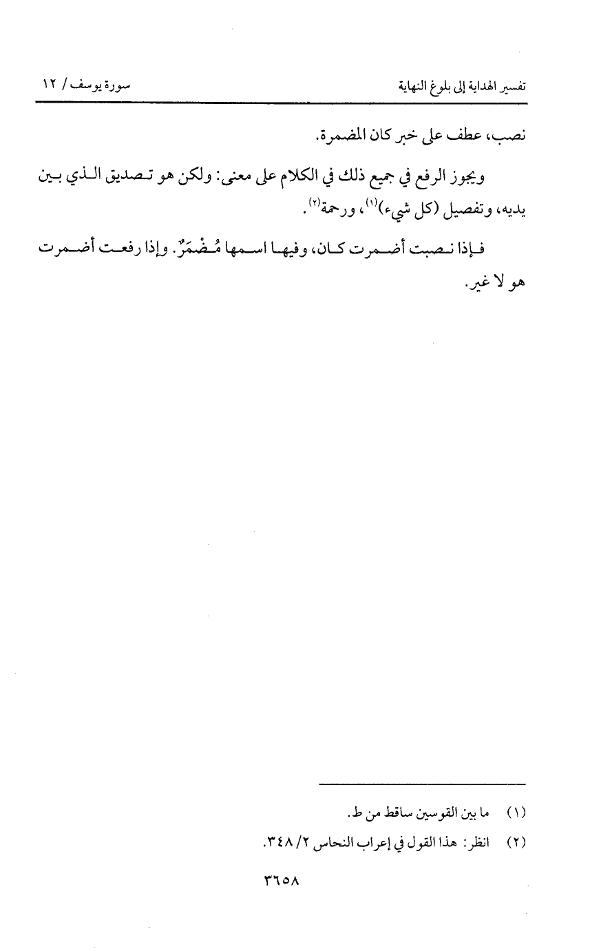 ويجوز الرفع في جميع ذلك في الكلام على معنى: ولكن هو تصديق الذي بين يديه، وتفصيل (كل شيء)، ورحمة.