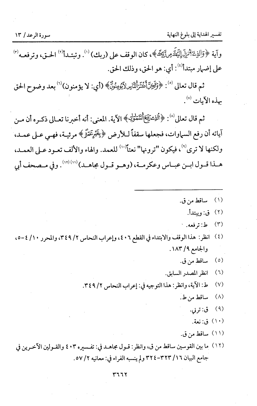 ثم قال تعالى: {الذي رَفَعَ السماوات} الآية. المعنى: أنه أخبرنا تعالى ذكره أن من آياته أن رفع السماوات، فجعلها سقفاً للأرض {بِغَيْرِ عَمَدٍ} مرئية، فهي على عمد، ولكنها لا ترى، فيكون " ترونها " نعتاً للعمد. والهاء والألف تعود على العمد، هذا قول ابن عباس وعكرمة، (وهو قول مجاهد). وفي مصحف أبي