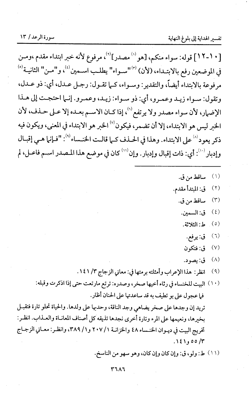قوله: سواء منكم، [هو مصدر]، مرفوع لأنه خبر ابتداء مقدم، ومن في الموضعين رفع بالابتداء، (لأن) " سواء " يطلب اسمين،، و " من " الثانية مرفوعة بالابتداء أيضاً، والتقدير: وسواء، كما تقول: رجل عدل، أي: ذو عدل، وتقول: سواء زيد وعمرو، أي: ذو سواء، زيد، وعمرو. إنما احتجت إلى هذا الإضمار، لأن سواء مصدر ولا يرتفع، إذا كان الاسم بعده إلا على حذف، لأن الخبر ليس هو الابتداء، إلا أن تضمر، فيكون الخبر هو الابتداء في المعنى، ويكون فيه ذكر يعود على الابتداء، إلا أن تضمر، فيكون الخبر هو الابتداء في المعنى، ويكون فيه ذكر يعود على الابتداء. وهذا في الحذف كما قالت الخنساء: " فإنما هي إقبال وإدبار: أي: ذات إقبال وإدبار. وإن كان في موضع هذا المصدر اسم فاعل، لم