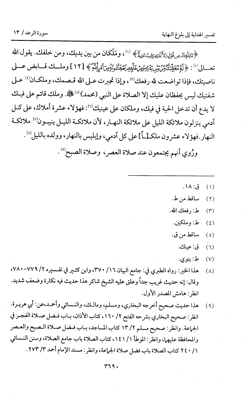 {مَّا يَلْفِظُ مِن قَوْلٍ إِلاَّ لَدَيْهِ رَقِيبٌ عَتِيدٌ} [ق: 18]، ومَلَكان من بين يديك، ومن خلفك. يقول الله تعالى: {لَهُ مُعَقِّبَاتٌ مِّن بَيْنِ يَدَيْهِ وَمِنْ خَلْفِهِ يَحْفَظُونَهُ مِنْ أَمْرِ الله} وملك قابض على ناصيتك، فإذا تواضعت لله رفعك، وإذا تجبرت على الله قصمك، وملكان على شفتيك ليس يحفظان عليك إلا الصلاة على النبي (محمد) A. وملك قائم على فيك لا يدع أن تدخل الحية فيك، وملكان على عينيك: فهؤلاء عشرة أملاك، على كل آدمي ينزلون ملائكة الليل على ملائكة النهار، لأن ملائكة الليل ينيبون ملائكة النهار. فهؤلاء عشرون ملك [اً] على كا آدمي، وإبليس بالنهار، وولده بالليل.