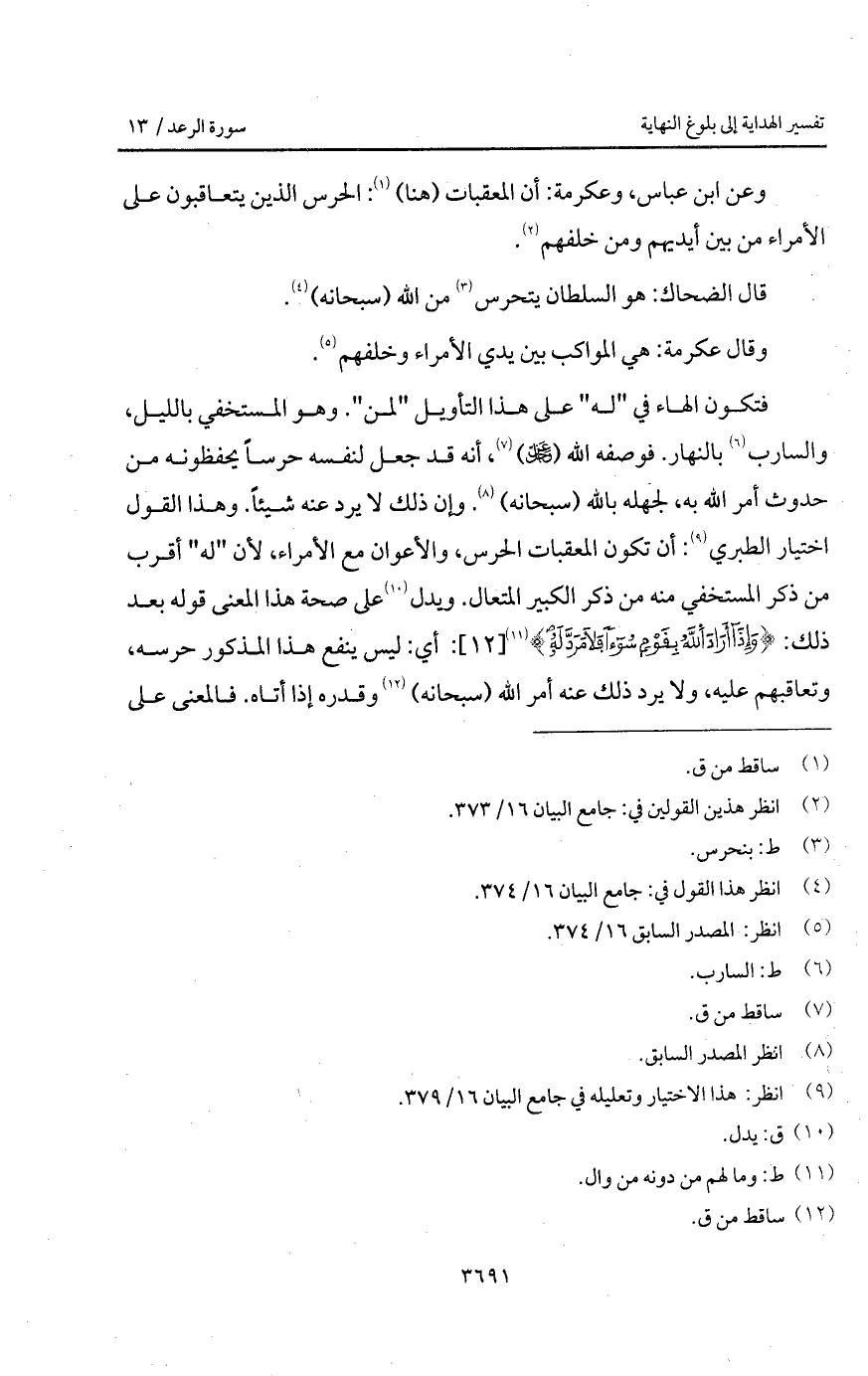 فتكون الهاء في " له " على هذا التأويل " لمن ". وهو المستخفي بالليل، والسارب بالنهار. فوصفه الله ( D) ، أنه قد جعل لنفسه حرساً يحفظونه من حدوث أمر الله به، لجهله بالله (سبحانه). وإن ذلك لا يرد عنه شيئاً. وهذا القول اختيار الطبري: أن تكون المعقبات الحرس، والأعوان مع الأمراء، لأن " له " أقرب من ذكر المستخفي منه من ذكر الكبير المتعال. ويدل على صحة هذا المعنى قوله بعد ذلك: {وَإِذَا أَرَادَ اللَّهُ بِقَوْمٍ سواءا فَلاَ مَرَدَّ لَهُ}: أي: ليس ينفع هذا المذكور حرسه، وتعاقبهم عليه. ولا يرد عنه أمر الله (سبحانه) وقدره إذا أتاه. فالمعنى على