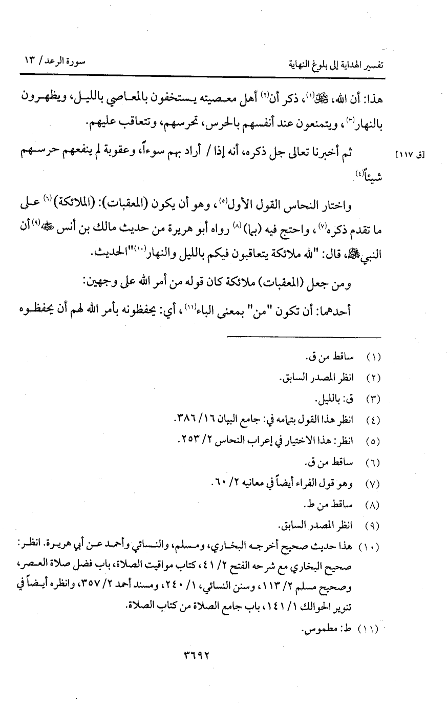 واختار النحاس القول الأول، وهو أن يكون (المعقبات): (الملائكة) على ما تقدم ذكره، واحتج فيه (بما) رواه أبو هريرة من حديث مالك بن أنس Bهـ أن النبي A قال: " لله ملائكة يتعاقبون فيكم بالليل والنهار "