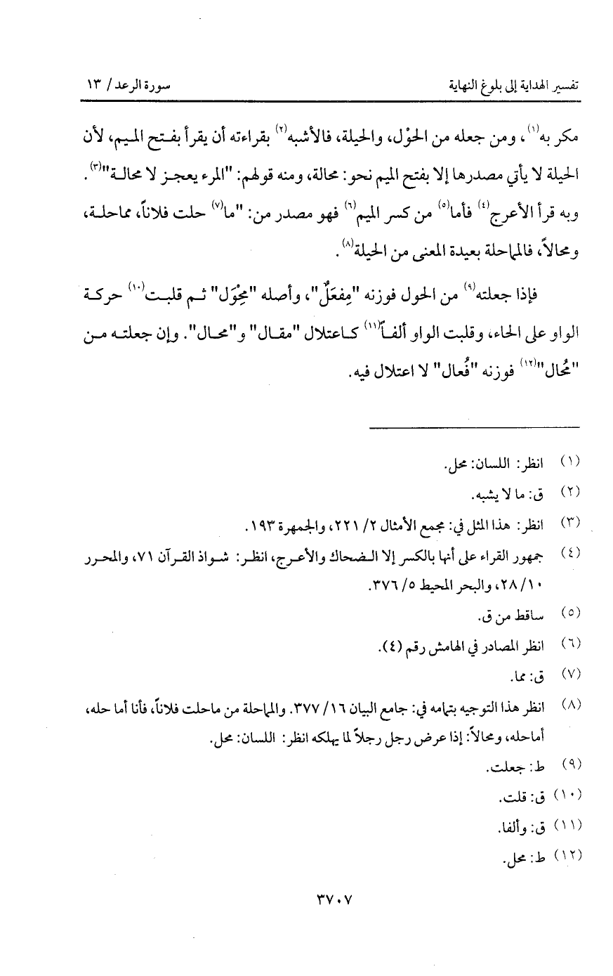 مكر به، ومن جعله من الحوْل، والحيلة، فالأشبه بقراءته أن يقرأ بفتح الميم، لأن الحيلة لا يأتي مصدرها إلا بفتح الميم نحو: محالة، ومنه قولهم: " المرء يعجز لا محالة ". وبه قرأ الأعرج فأما من كسر الميم فهو مصدر من: " ما حلت فلاناً، مماحلة، ومحالاً، فاللماحلة بعيدة المعنى من الحيلة.