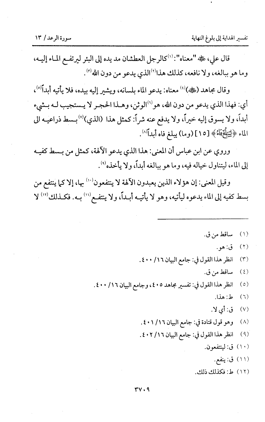 قال علي، Bهـ " معناه ": كالرجل العطشان مد يده إلى البئر ليرتفع الماء إليه، وما هو ببالغه، ولا نافعه، كذلك هذا الذي يدعو من دون الله.