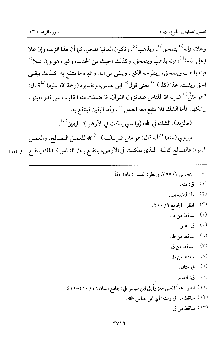 كذلك يبقى الحق ويثبت " هذا (كله) معنى قول ابن عباس، وتفسيره (رحمة الله عليه) قال: " هو مَثَلٌ ضربه الله للناس عند نزول القرآن، فاحتملت منه القلوب على قدر يقينها وشكها. فأما الشك فلا ينفع معه العمل، وأما اليقين فينتفع به.