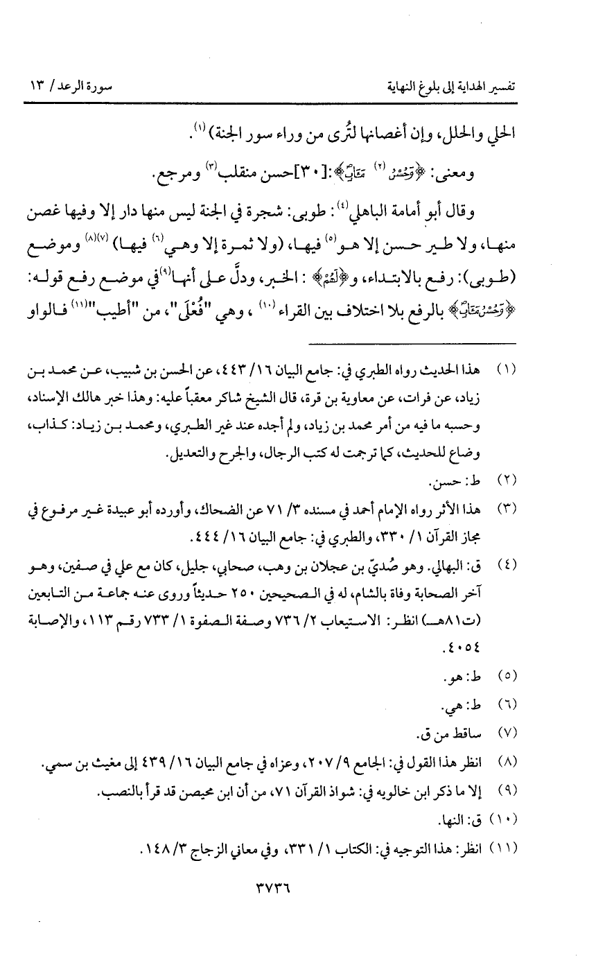 وقال أبو أمامة الباهلي: طوبى: شجرة في الجنة ليس منها دار إلا وفيها غصن منها، ولا طير حسن إلا هو فيها، (ولا ثمرة إلا وهي فيها) وموضع (طوبى): رفع بالابتداء، و {لَهُمْ}: الخبر، ودلَّ على أنها في موضع رفع قوله: {وَحُسْنُ مَآبٍ} بالرفع بلا اختلاف بين القراء، وهي " فُعْلَى "، من " أطيب " فالواو
