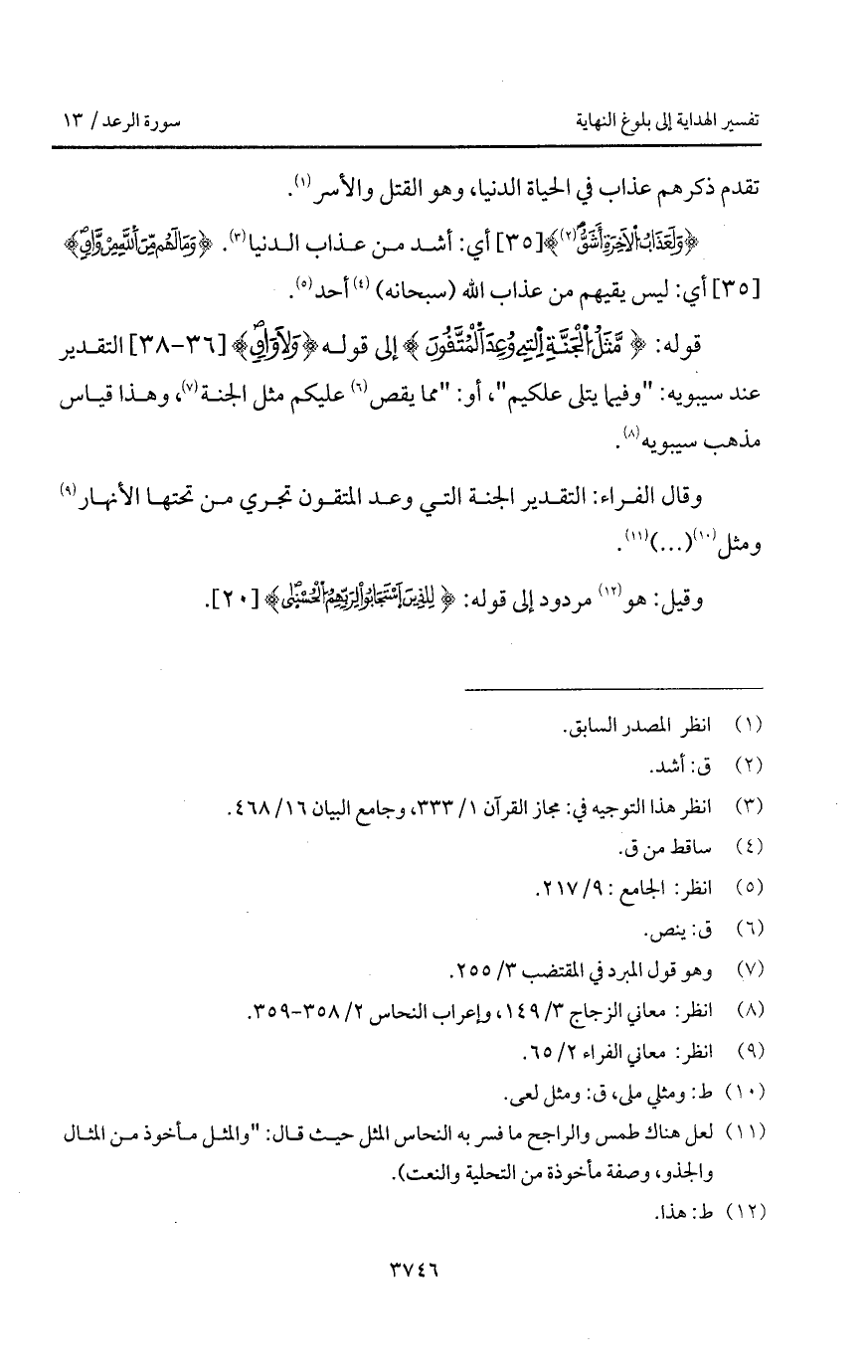 قوله: {مَّثَلُ الجنة التي وُعِدَ المتقون} إلى قوله {وَلاَ وَاقٍ} التقدير عند سيبويه: " وفيما يتلى عليكم "، أو: " مما يقص عليكم مثل الجنة، وهذا قياس مذهب سيبويه.