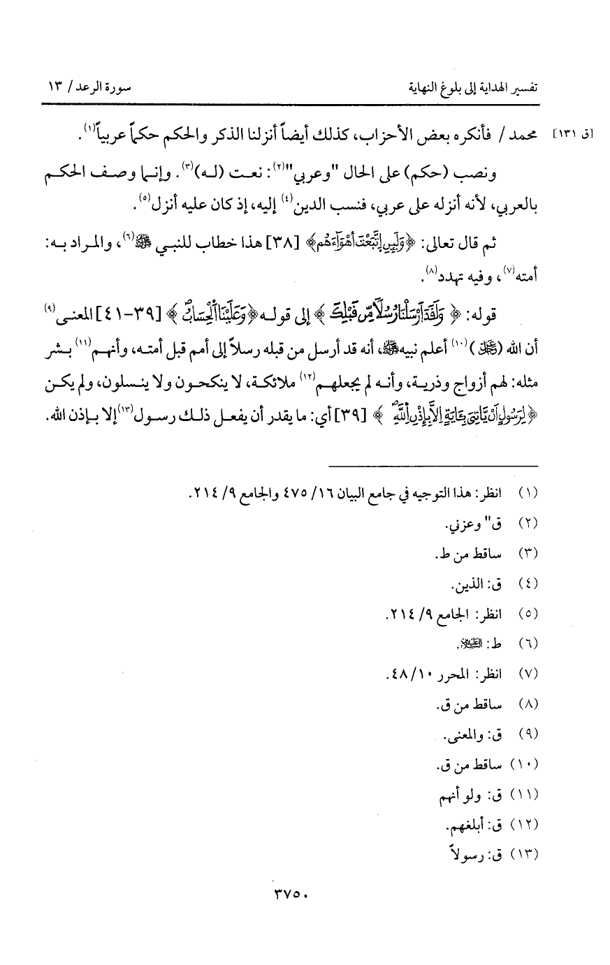 قوله: {وَلَقَدْ أَرْسَلْنَا رُسُلاً مِّن قَبْلِكَ} إلى قوله {وَعَلَيْنَا الحساب} المعنى أن الله ( D) أعلم نبيه A، أنه قد أرسل من قبله رسلاً من قبل أمته، وأنهم بشر مثله: لهم أزواج وذرية، وأنه لم يجعلهم ملائكة، لا ينطحون ولا ينسلون، ولم يكن {لِرَسُولٍ أَن يَأْتِيَ بِآيَةٍ إِلاَّ بِإِذْنِ الله} أي: ما يقدر أن يفعل ذلك رسول إلا بإذن الله.