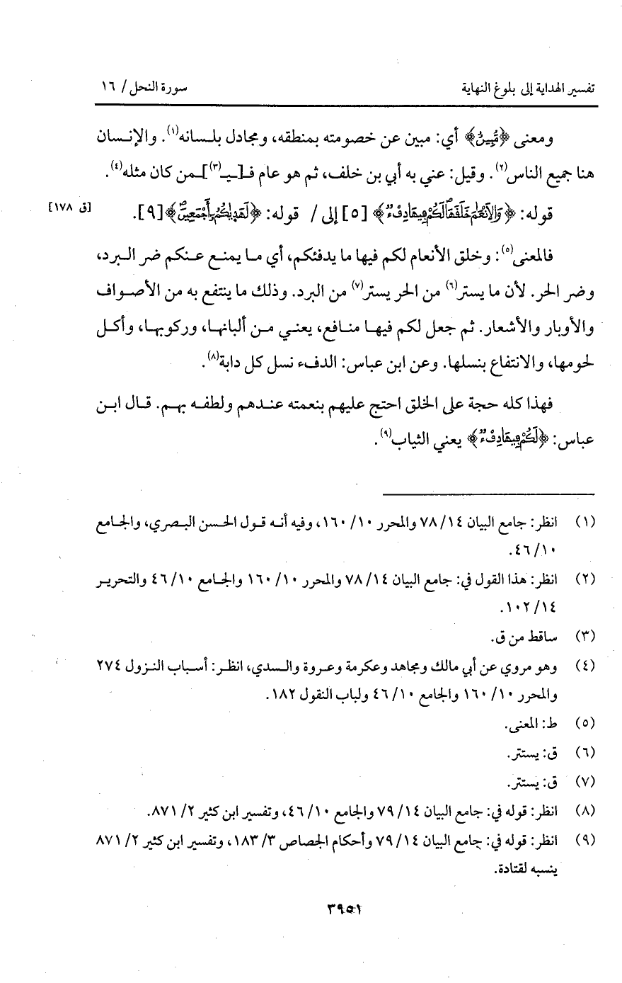 فالمعنى: وخلق الأنعام لكم فيها ما يدفئكم، أي ما يمنع عنكم ضر البرد، وضر الحر. لأن ما يستر من الحر يستر من البرد. وذلك ما ينتفع به من الأصواف والأوبار والأشعار. ثم جعل لكم فيها منافع، يعني من ألبانها، وركوبها، وأكل لحومها، والانتفاع بنسلها. وعن ابن عباس: الدفء نسل كل دابة.