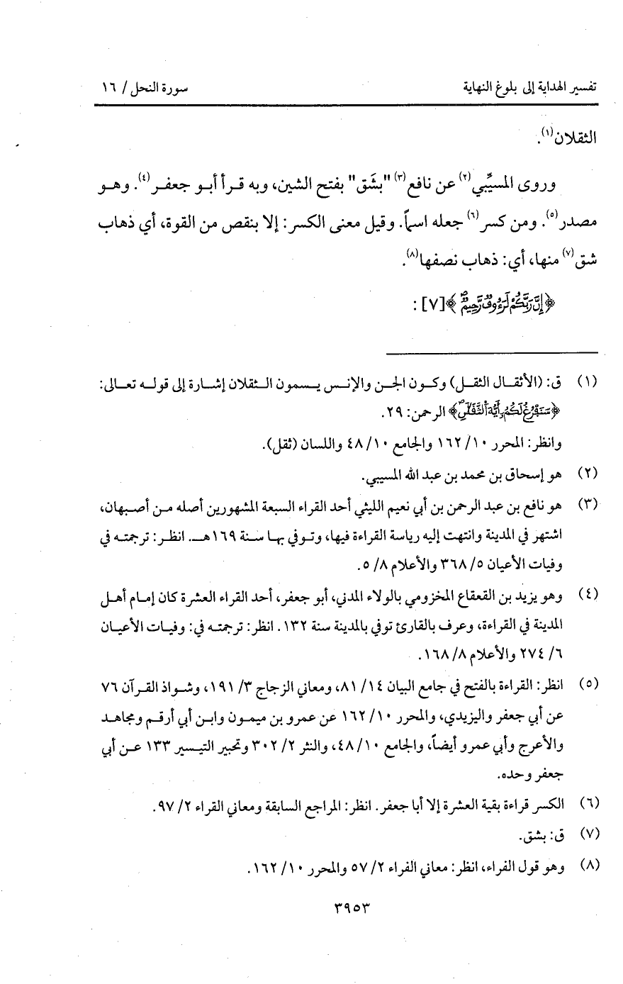 وروى المسيِّبي عن نافع " بشَقَ " بفتح الشين، وبه قرأ أبو جعفر. وهو مصدر. ومن كسر جعله اسماً. وقيل معنى الكسر: إلا بنقص من القوة، أي ذهاب شق منها، أي: ذهاب نصفها.