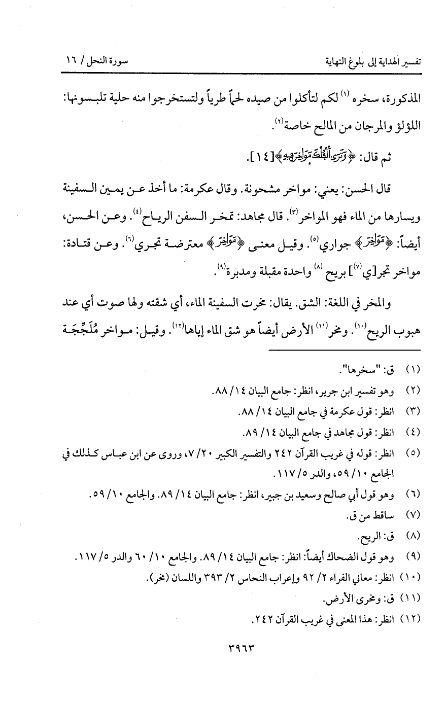 قال الحسن: يعني: مواخر مشحونة. وقال عكرمة: ما أخذ عن يمين السفينة ويسارها من الماء فهو المواخر. قال مجاهد: تمخر السفن الرياح. وعن الحسن، أيضاً: {مَوَاخِرَ} جواري. وقيل معنى {مَوَاخِرَ} معترضة تجري. وعن قتادة: مواخر تجر [ي] بريح واحدة مقبلة ومدبرة.