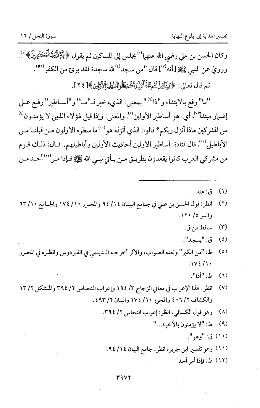 " ما " رفع بالابتداء و " ذا " بمعنى: الذي، خبر ل " ما " و " أساطير " رفع على إضمار مبتدأ، أي: هو أساطير الأولين. والمعنى: وإذا قيل لهؤلاء الذين لا يؤمنون من المشركين ماذا أنزل ربكم؟ قالوا: الذي أنزله هو ما سطره الأولون من قبلنا من الأباطيل. قال قتادة: أساطير الأولين أحاديث الأولين وأباطيلهم. قال: ذلك قوم من مشركي العرب كانوا يقعدون بطريق من يأتي نبي الله A فإذا مر أحد من
