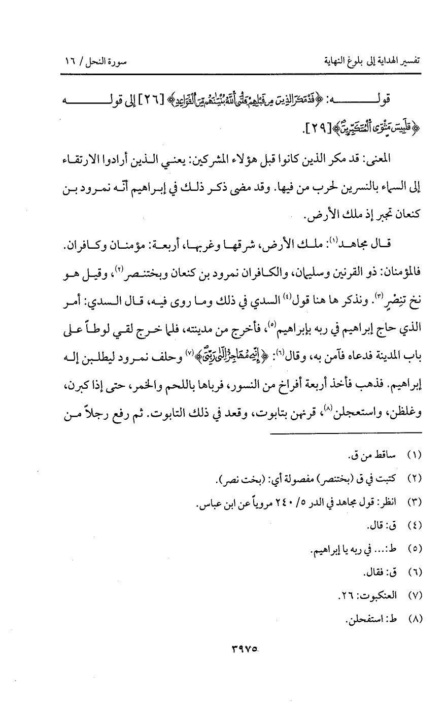 قال مجاهد: ملك الأرض، شرقها وغربها، أربعة: مؤمنان وكافران. فالمؤمنان: ذو القرنين وسليمان، والكافران نمرود بن كنعان وبختنصر، وقيل هو نخ تنِصْرٍ. ونذكرها هنا قول السدي في ذلك وما روى فيه، قال السدي: أمر الذي حاج إبراهيم في ربه بإبراهيم، فأخرج من مدينته، فلما خرج لقي لوطاً على باب المدينة فدعاه فآمن به، وقال: {إِنِّي مُهَاجِرٌ إلى ربي} [العنكبوت: 26] وحلف نمرود ليطلبن إله إبراهيم. فذهب فأخذ أربعة أفراخ من النسور، فرباها باللحم والخمر، حتى إذا كبرن، وغلظن، واستعجلن، قرنهن بتابوت، وقعد في ذلك التابوت. ثم رفع رجلاً من