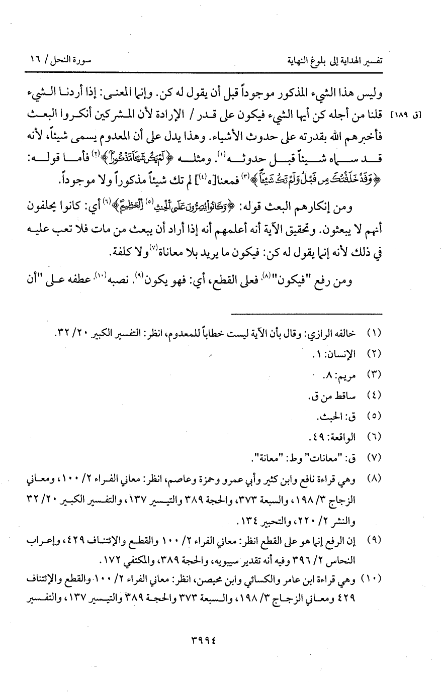 وليس هذا الشيء المذكور موجوداً قبل أن يقول له كن. وإنما المعنى: إذا أردنا الشيء قلنا من أجله كن أيها الشيء فيكون على قدر / الإرادة لأن المشركين أنكروا البعث فأخبرهم الله بقدرته على حدوث الأشياء. وهذا يدل على أن المعدوم يسمى شيئاً، لأنه قد سماه شيئاً قبل حدوثه. ومثله {لَمْ يَكُن شَيْئاً مَّذْكُوراً} [الإنسان: 1] فأما قوله: {وَقَدْ خَلَقْتُكَ مِن قَبْلُ وَلَمْ تَكُ شَيْئاً} [مريم: 9] فمعنا [هـ] لم تك شيئاً مذكوراً ولا موجوداً.