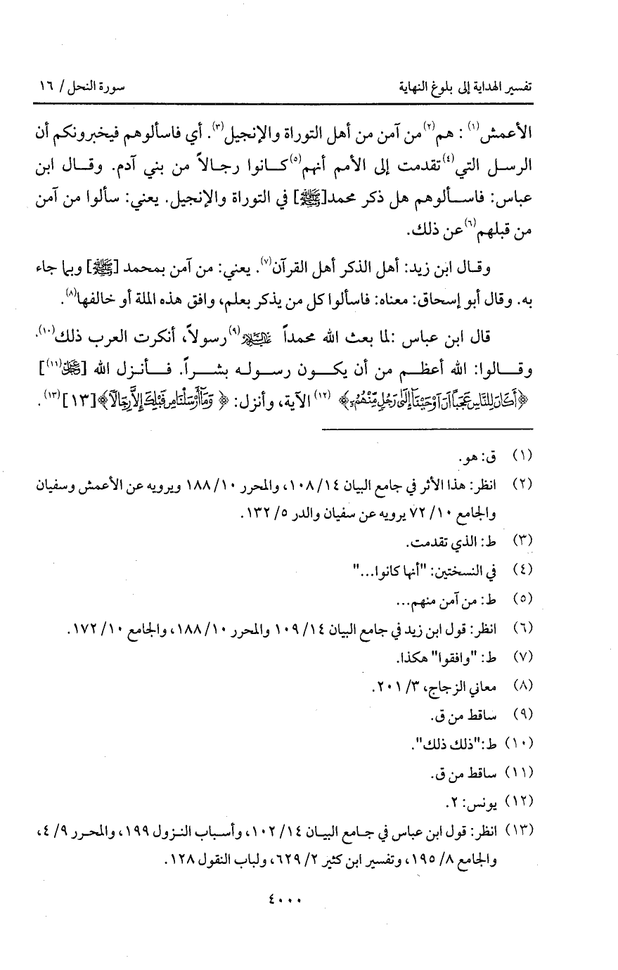 وقال ابن زيد: أهل الذكر أهل القرآن. يعني: من آمن بمحمد [ A] وبما جاء به. وقال أبو إسحاق: معناه: فاسألوا كل من يذكر بعلم، وافق هذه الملة أو خالفها.