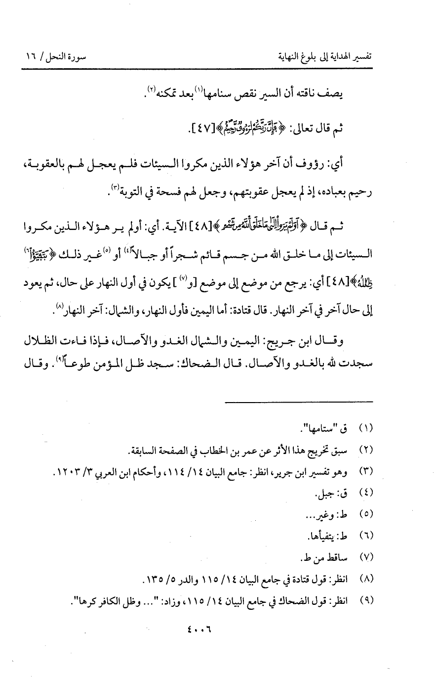 قال {أَوَلَمْ يَرَوْاْ إلى مَا خَلَقَ الله مِن شَيْءٍ} الآية: أي: أولم ير هؤلاء الذين مكروا السيئات إلى ما خلق الله من جسم قائم شجراً أو جبالاً أو غير ذلك {يَتَفَيَّؤُاْ ظِلاَلُهُ} أي: يرجع من موضع إلى موضع [و] يكون في أول النهار على حال، ثم يعود إلى حال آخر في آخر النهار. قال قتادة: أما اليمين فأول النهار، والشمال: آخر النهار.