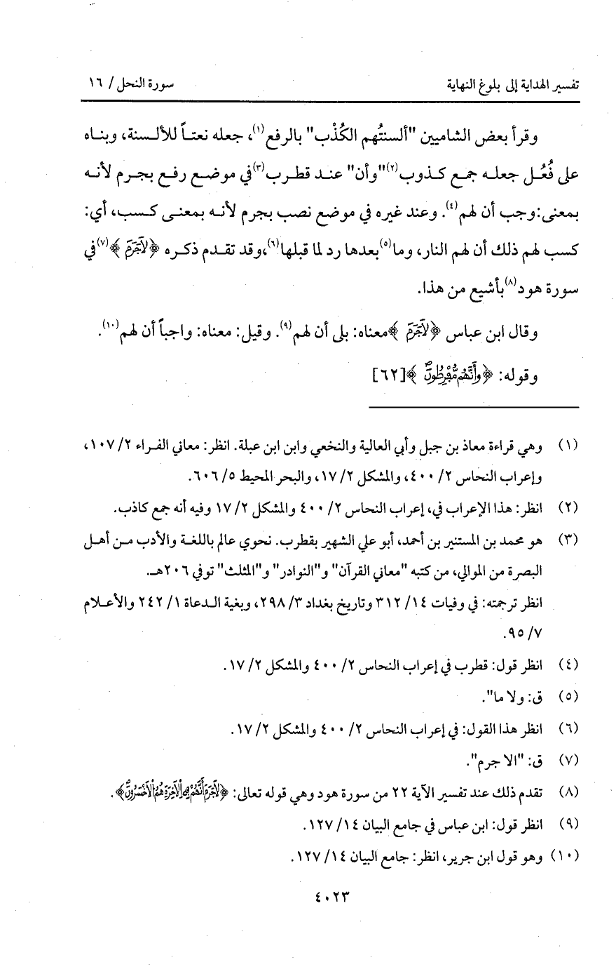 وقرأ بعض الشاميين " ألسنتُهم الكُذْب " بالرفع، جعله نعتاً للألسنة، وبناه على فُعُل جعله جمع كذوب " وأن " عند قطرب في موضع رفع بجرم لأنه بمعنى: وجب أن لهم. وعند غيره في موضع نصب بجرم لأنه بمعنى كسب، أي: كسب لهم ذلك أن لهم النار، وما بعدها رد لما قبلها، وقد تقدم ذكره {لاَ جَرَمَ} في سورة هود بأشيع من هذا.
