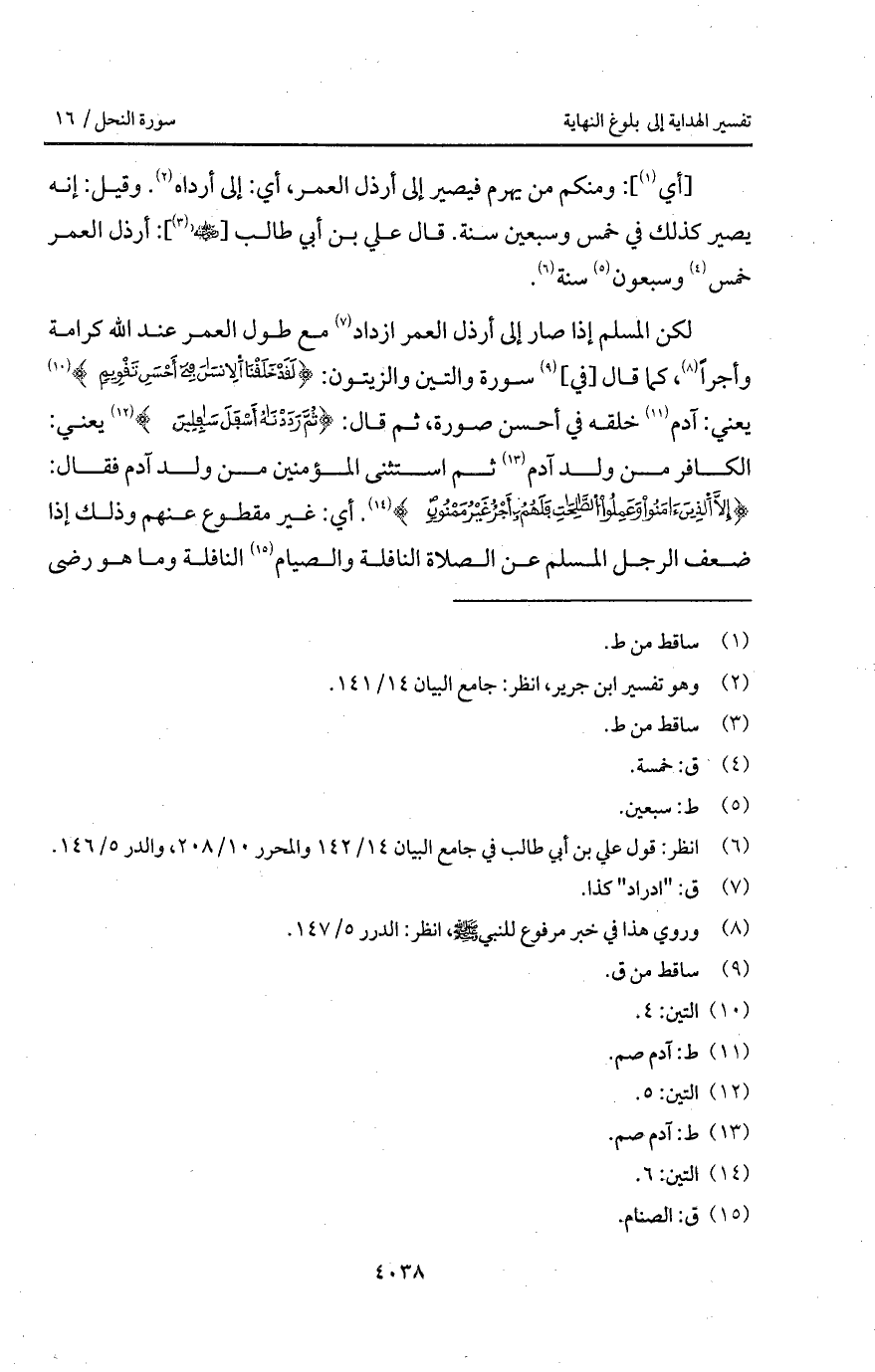 لكن المسلم إذا صار إلى أرذل العمر ازداد مع طول العمر عند الله كرامة وأجراً، كما قال [في] سورة والتين والزيتون: {لَقَدْ خَلَقْنَا الإنسان في أَحْسَنِ تَقْوِيمٍ} [التين: 4] يعني: آدم خلقه في أحسن صورة، ثم قال: {ثُمَّ رَدَدْنَاهُ أَسْفَلَ سَافِلِينَ} [التين: 5] يعني: الكافر من ولد آدم ثم استثنى المؤمنين من ولد آدم فقال: {إِلاَّ الذينءَامَنُواْ وَعَمِلُواْ الصالحات فَلَهُمْ أَجْرٌ غَيْرُ مَمْنُونٍ} [التين: 6]. أي: غير مقطوع عنهم وذلك إذا ضعف الرجل المسلم عن الصلاة النافلة والصيام النافلة وما هو رضى