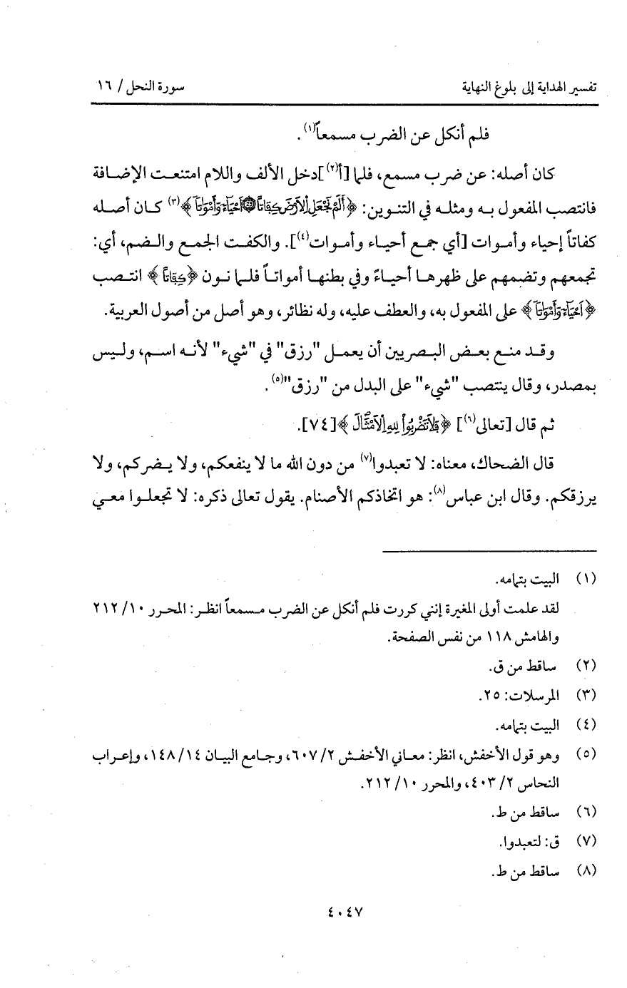فلم أنكل عن الضرب مسمعاً. ... كان أصله: عن ضرب مسمع، فلما [أ] دخل الألف واللام امتنعت الإضافة فانتصب المفعول به ومثله في التنوين: {أَلَمْ نَجْعَلِ الأرض كِفَاتاً * أَحْيَآءً وأمواتا} [المرسلات: 25 - 26] كان أصله كفاتاً إحياء وأموات [أي جمع أحياء وأموات]. والكفت الجمع والضم، أي: تجمعهم وتضمهم على ظهرها أحياءً وفي بطنها أمواتاً فلما نون {كِفَاتاً} انتصب {أحْيَآء وأموات} على المفعول به، والعطف عليه، وله نظائر، وهو أصل من أصول العربية.