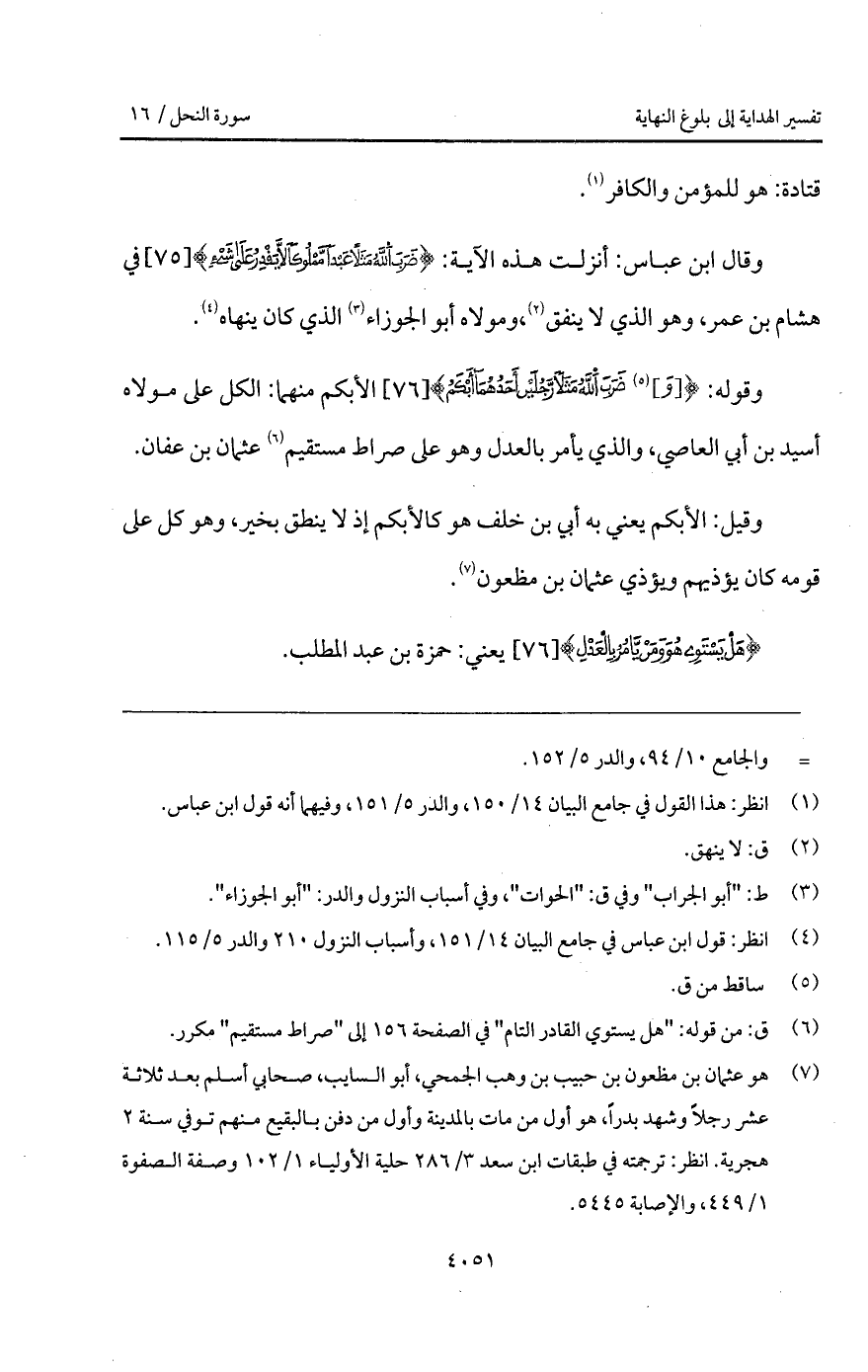 وقوله: {[وَ] ضَرَبَ الله مَثَلاً رَّجُلَيْنِ أَحَدُهُمَآ أَبْكَمُ} الأبكم منهما: الكل على مولاه أسيد بن أبي العاصي، والذي يأمر بالعدل وهو على صراط مستقيم عثمان بن عفان.