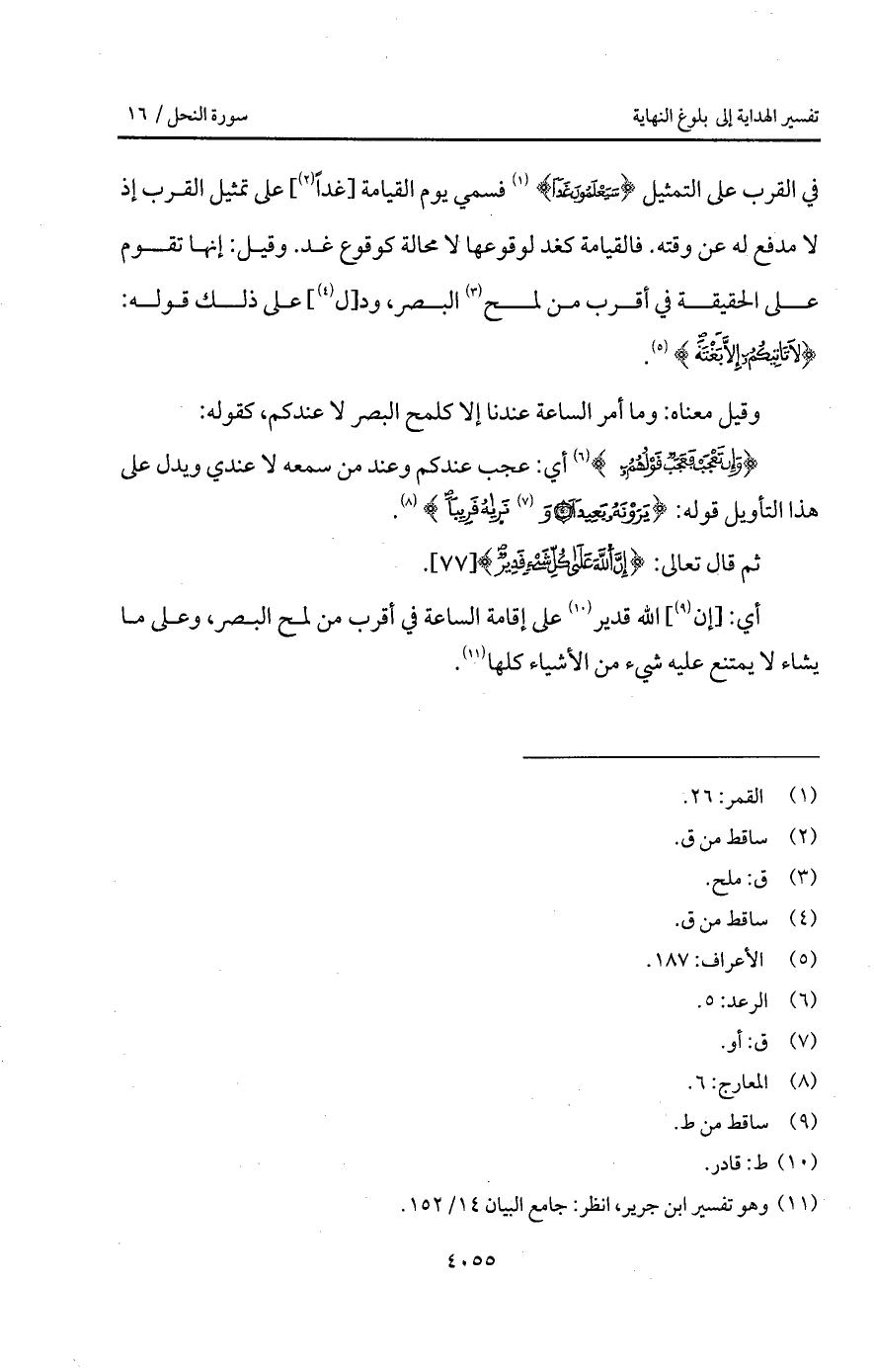 في القرب على التمثيل {سَيَعْلَمُونَ غَداً} [القمر: 26] فسمي يوم القيامة [غداً] على تمثيل القرب إذ لا مدفع له عن وقته. فالقيامة كغد لوقوعها لا محالة كوقوع غد. وقيل: إنها تقوم على الحقيقة في أقرب من لمح البصر، ودلأل] على ذلك قوله: {لاَ تَأْتِيكُمْ إِلاَّ بَغْتَةً} [الأعراف: 187].