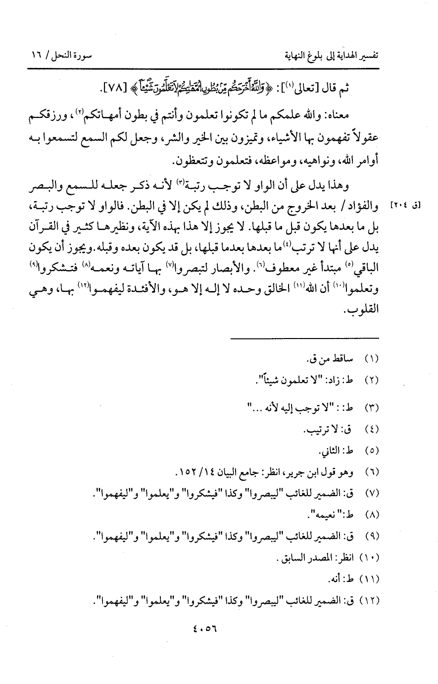 وهذا يدل على أن الواو لا توجب رتبة لأنه ذكر جعله للسمع والبصر والفؤاد / بعد الخروج من البطن، وذلك لم يكن إلا في البطن. فالواو لا توجب رتبة، بل ما بعدها يكون قبل ما قبلها. لا يجوز إلا هذا بهذه الآية، ونظيرها كثير في القرآن يدل على أنها لا ترتب ما بعدها بعدما قبلها، بل قد يكون بعده وقبله. ويجوز أن يكون الباقي مبتدأ غير معطوف. والأبصار لتبصروا بها آياته ونعمه فتشكروا وتعلموا أن الله الخالق وحده لا إله إلا هو، والأفئدة ليفهموا بها، وهي القلوب.