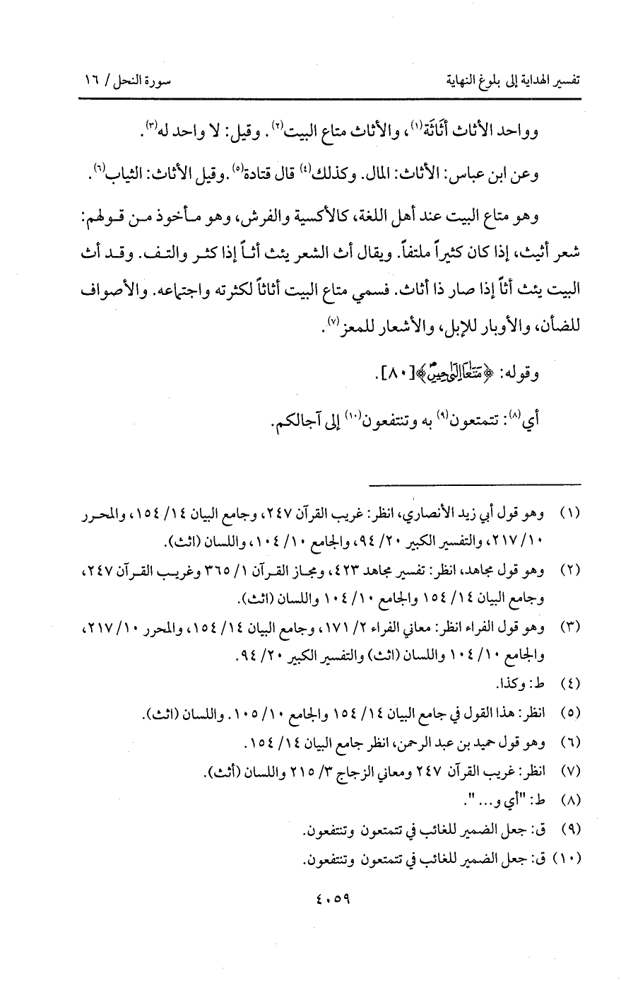 وهو متاع البيت عند أهل اللغة، كالأكسية والفرش، وهو مأخوذ من قولهم: شعر أثيث، إذا كان كثيراً ملتفاً. ويقال أث الشعر يئث أثاً إذا كثر والتف. وقد أث البيت يئث أثاً إذا صار ذا أثاث. فسمي متاع البيت أثاثاً لكثرته واجتماعه. والأصواف للضأن، والأوبار للإبل، والأشعار للمعز.