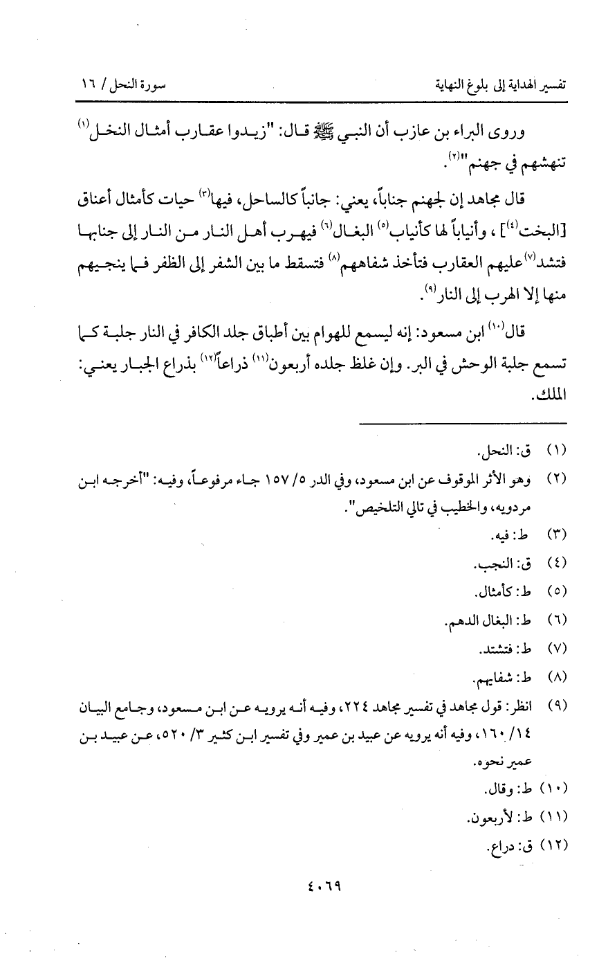 قال مجاهد إن لجنهم جناباً، يعني: جانباً كالساحل، فيها حيات كأمثال أعناق [البخت]، وأنياباً لها كأنياب البغال فيهرب أهل النار من النار إلى جنابها فتشد عليهم العقارب فتأخذ شفاههم فتسقط ما بين الشفر إلى الظفر فما ينجيهم منها إلا الهرب إلى النار.