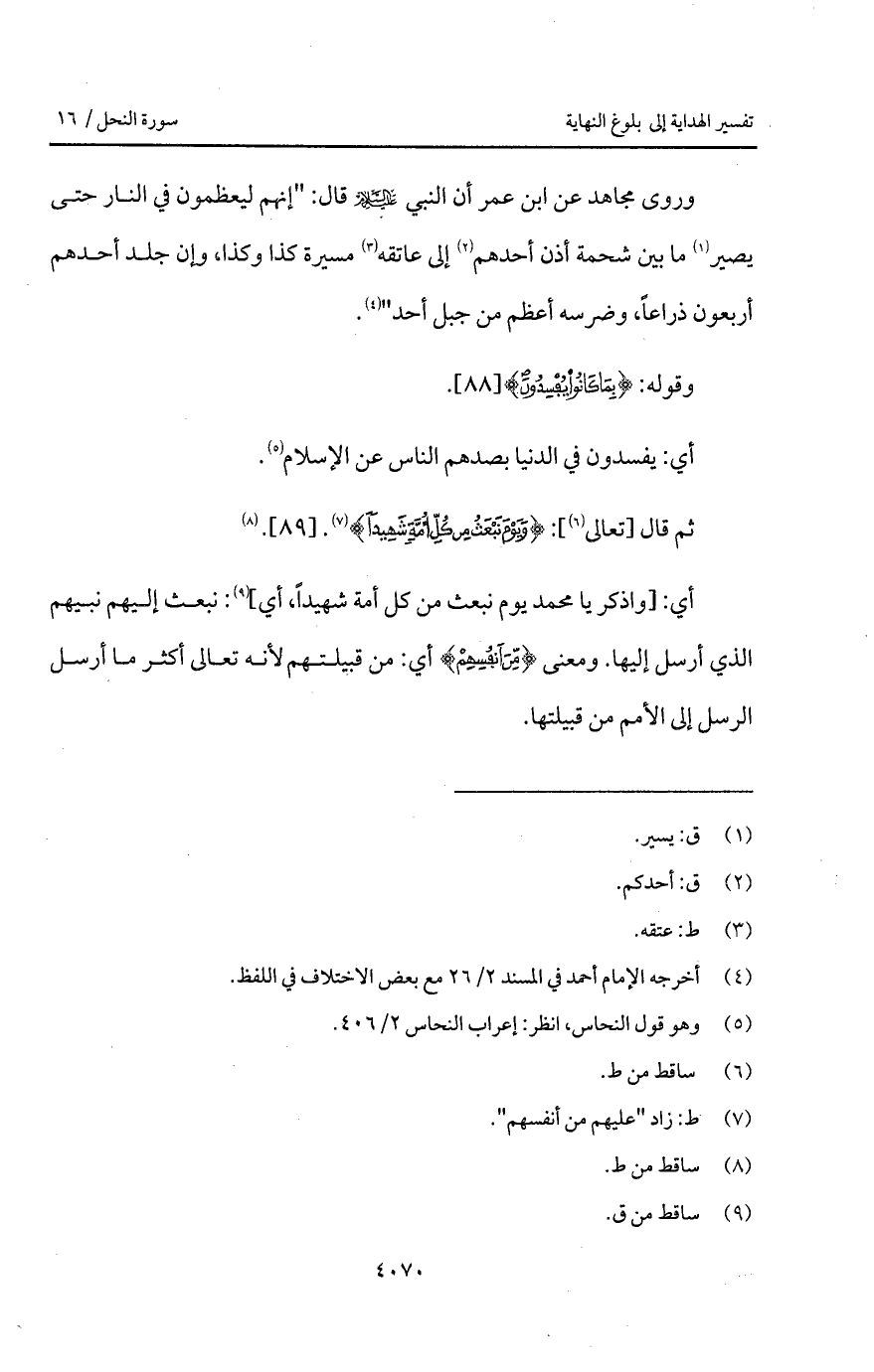 وروى مجاهد عن ابن عمر أن النبي عليه السلام قال: " إنهم ليعظمون في النار حتى يصير ما بين شحمة أذن أحدهم إلى عاتقه مسيرة كذا وكذا، وإن جلد أحدهم أربعون ذراعاً، وضرسه أعظم من جبل أحد ".