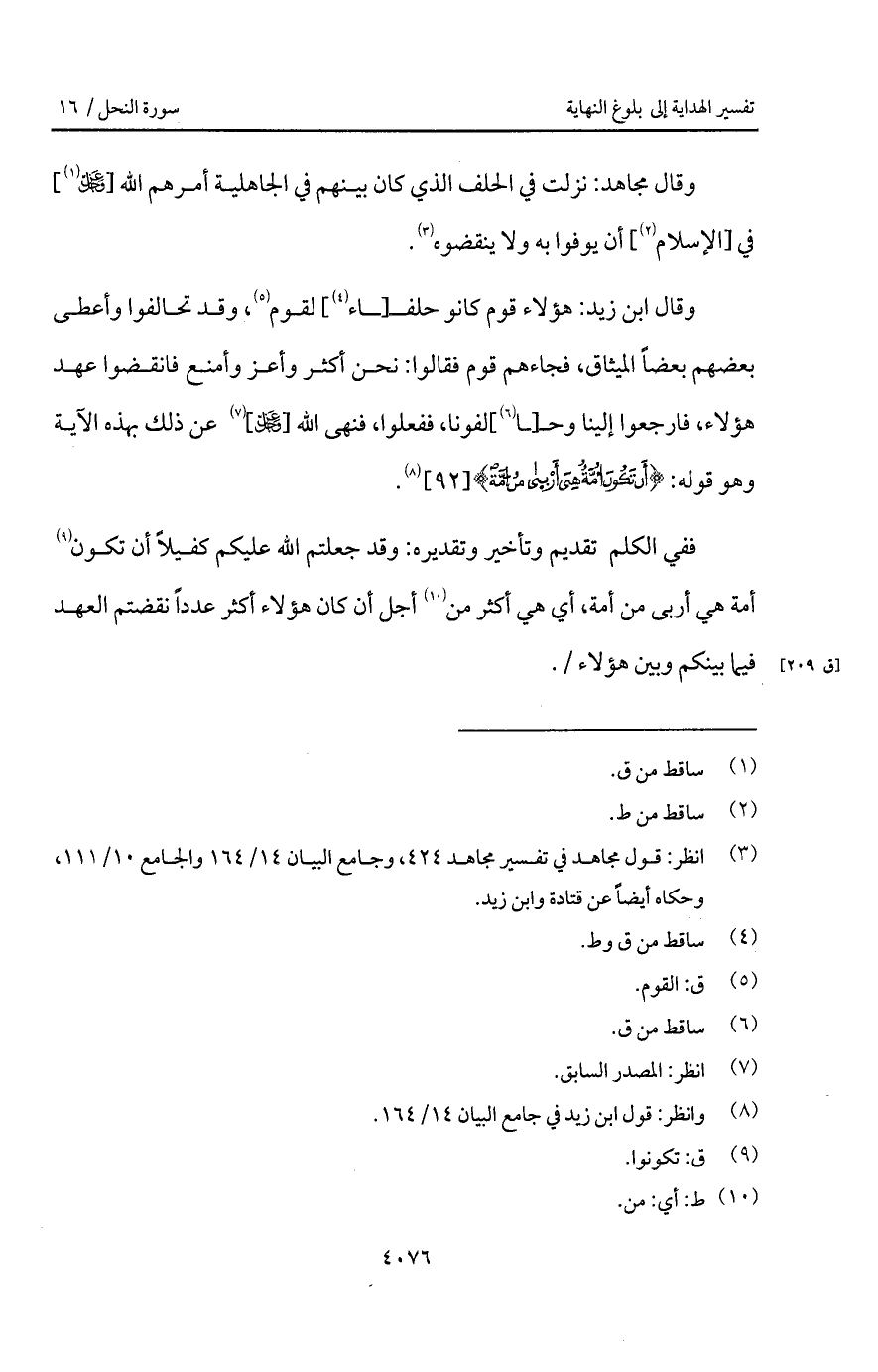 ففي الكلم تقديم وتأخير وتقديره: وقد جعلتم الله عليكم كفيلاً أن تكون أمة هي أربى من أمة، أي هي أكثر من أجل أن كان هؤلاء أكثر عدداً نقضتم العهد فيما بينكم وبين هؤلاء /.