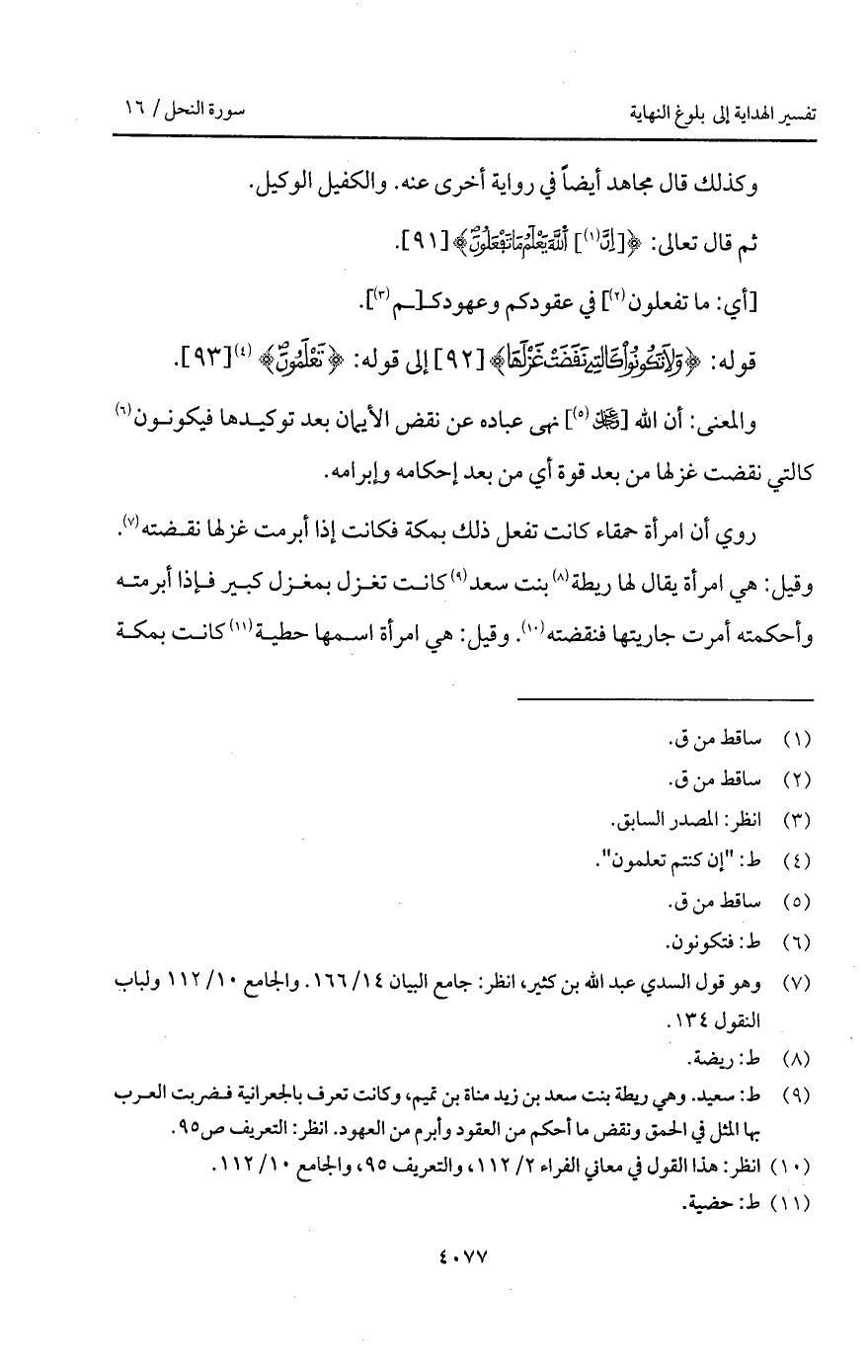 والمعنى: أن الله [ D] نهى عباده عن نقض الأيمان بعد توكيدها فيكونون كالتي نقضت غزلها من بعد قوة أي من بعد إحكامه وإبرامه.
