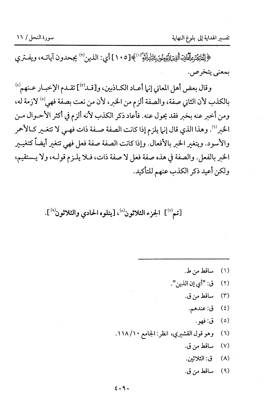 وقال بعض أهل المعاني إنما أعاد الكاذبين، و [قد] تقدم الإخبار عنهم بالكذب لأن الثاني صفة، والصفة ألزم من الخبر، لأن من نعت بصفة فهي لازمة له، ومن أخبر عنه بخبر فقد يحول عنه. فأعاد ذكر الكذب لأنه ألزم في أكثر الأحوال من الخبر. وهذا الذي قال إنما يلزم إذا كانت الصفة صفة ذات فهي لا تتغير كالأحمر والأسود. ويتغير الخبر بالأفعال. وإذا كانت الصفة صفة فعل فهي تتغير أيضاً كتغيير الخبر بالفعل. والصفة في هذه صفة فعل لا صفة ذات، فلا يلزم قوله، ولا يستقيم، ولكن أعيد ذكر الكذب عنهم للتأكيد.