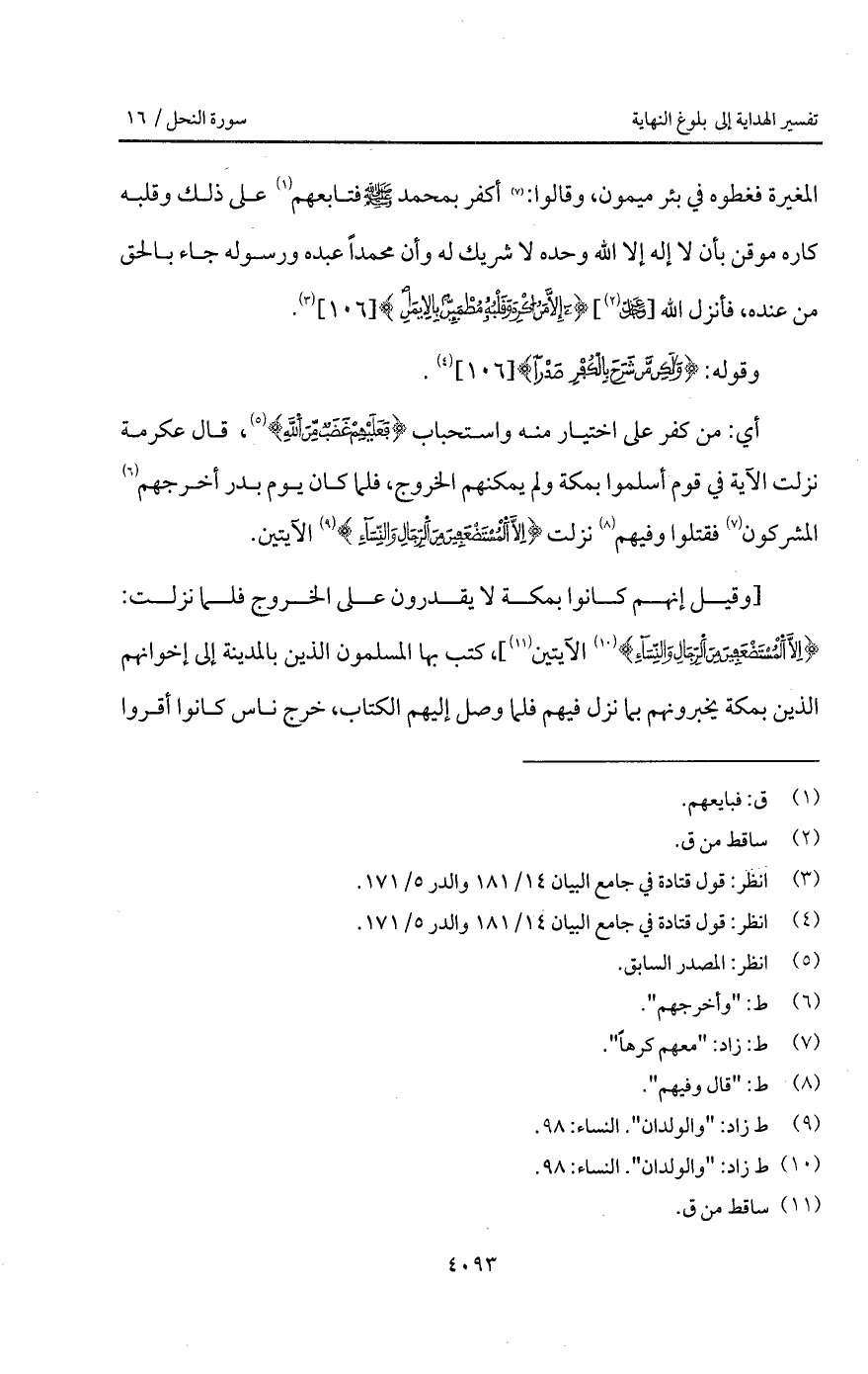 المغيرة فغطوه في بئر ميمون، وقالوا: أكفر بمحمد A فتابعهم على ذلك وقلبه كاره موقن بأن لا إله إلا الله وحده لا شريك له وأن محمداً عبده ورسوله جاء بالحق من عنده، فأنزل الله [ D] { إِلاَّ مَنْ أُكْرِهَ وَقَلْبُهُ مُطْمَئِنٌّ بالإيمان}.