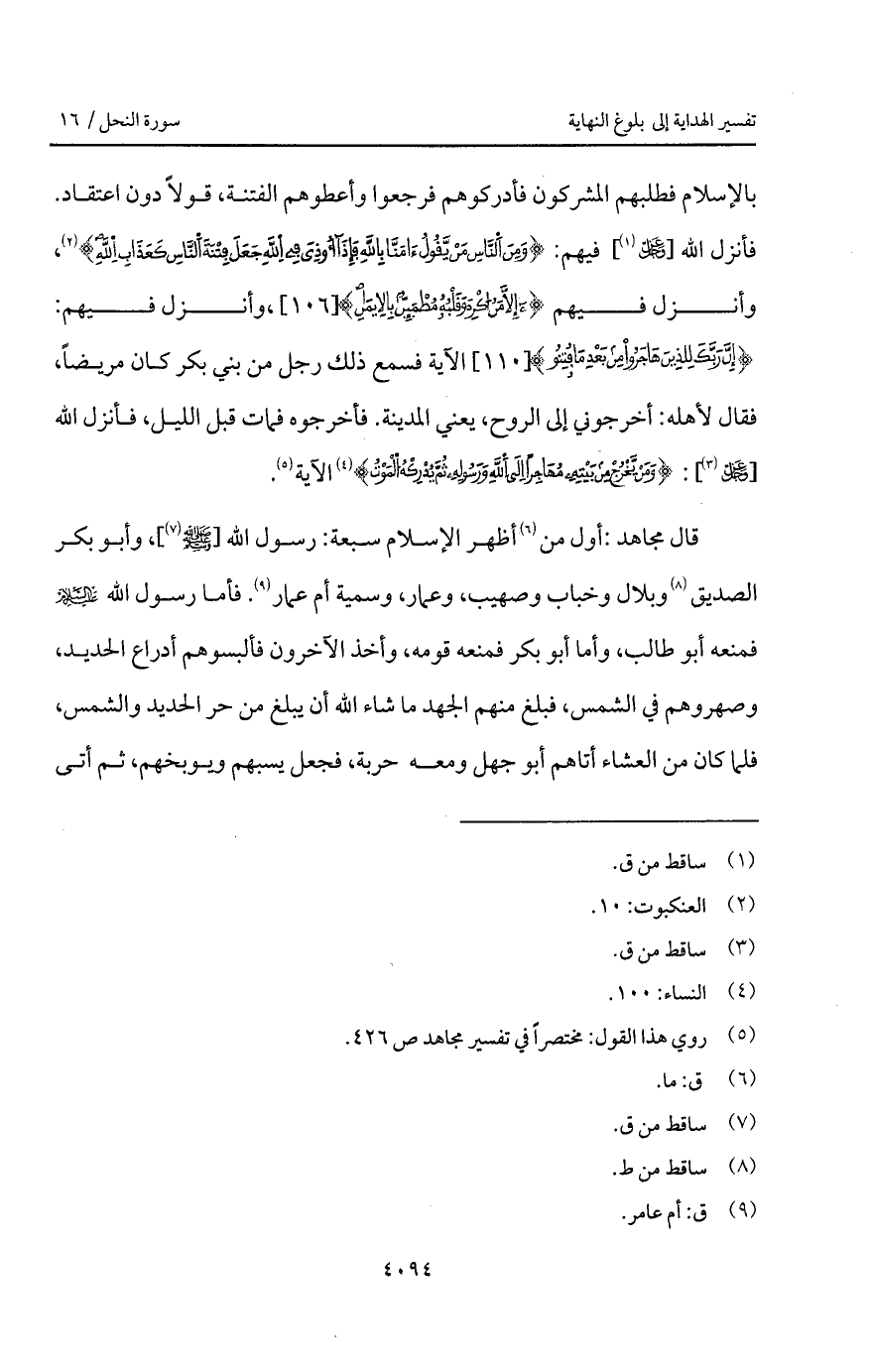 بالإسلام فطلبهم المشركون فأدركوهم فرجعوا وأعطوهم الفتنة، قولاً دون اعتقاد. فأنزل الله [ D] فيهم: {وَمِنَ الناس مَن يِقُولُ آمَنَّا بالله فَإِذَآ أُوذِيَ فِي الله جَعَلَ فِتْنَةَ الناس كَعَذَابِ الله} [العنكبوت: 10]، وأنزل فيهم {إِلاَّ مَنْ أُكْرِهَ وَقَلْبُهُ مُطْمَئِنٌّ بالإيمان}، وأنزل فيهم: {إِنَّ رَبَّكَ لِلَّذِينَ هَاجَرُواْ مِن بَعْدِ مَا فُتِنُواْ} [النحل: 110] الآية فسمع ذلك رجل من بني بكر كان مريضاً، فقال لأهله: أخرجوني إلى الروح، يعني المدينة. فأخرجوه فمات قبل الليل، فأنزل الله [ D] : { وَمَن يَخْرُجْ مِن بَيْتِهِ مُهَاجِراً إِلَى الله وَرَسُولِهِ ثُمَّ يُدْرِكْهُ الموت} [النساء: 100] الآية.