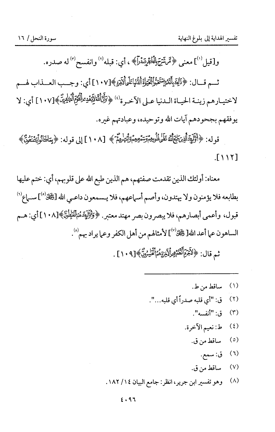 معناه: أولئك الذين تقدمت صفتهم، هم طبع الله على قلوبهم، أي ختم عليها بطابعه فلا يؤمنون ولا يهتدون، وأصم أسماعهم، فلا يسمعون داعي الله [ D] سماع قبول، وأعمى أبصارهم، فلا يبصرون بصر مهتد معتبر. {وأولئك هُمُ الغافلون} أي: هم الساهون عما أعد الله [ D] لأمثالهم من أهل الكفر وعما يراد بهم.