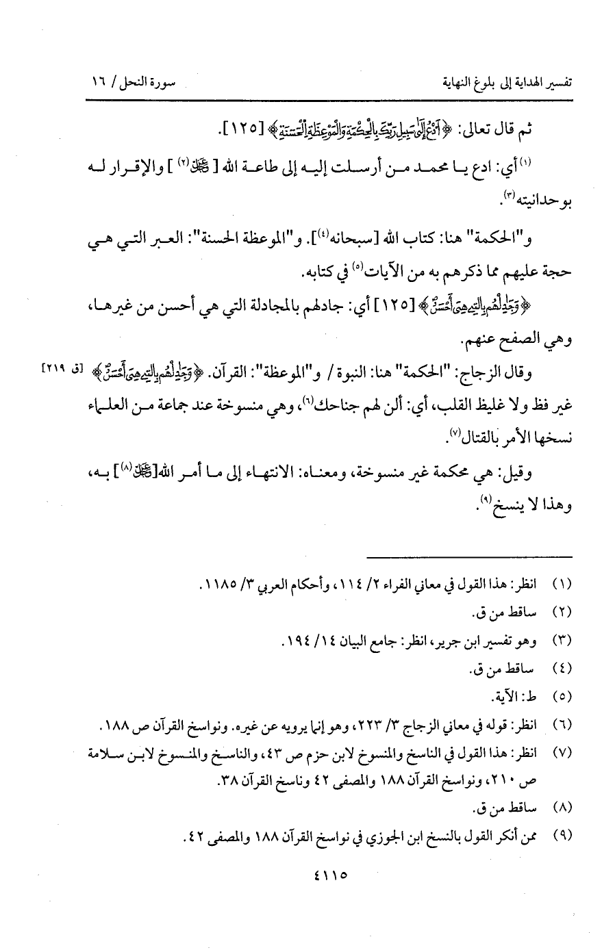 وقال الزجاج: " الحكمة " هنا: النبوة / و " الموعظة ": القرآن: {وجادلهم بالتي هِيَ أَحْسَنُ} غير فظ ولا غليظ القلب، أي: ألن لهم جناحك، وهي منسوخة عند جماعة من العلماء نسخها المر بالقتال.
