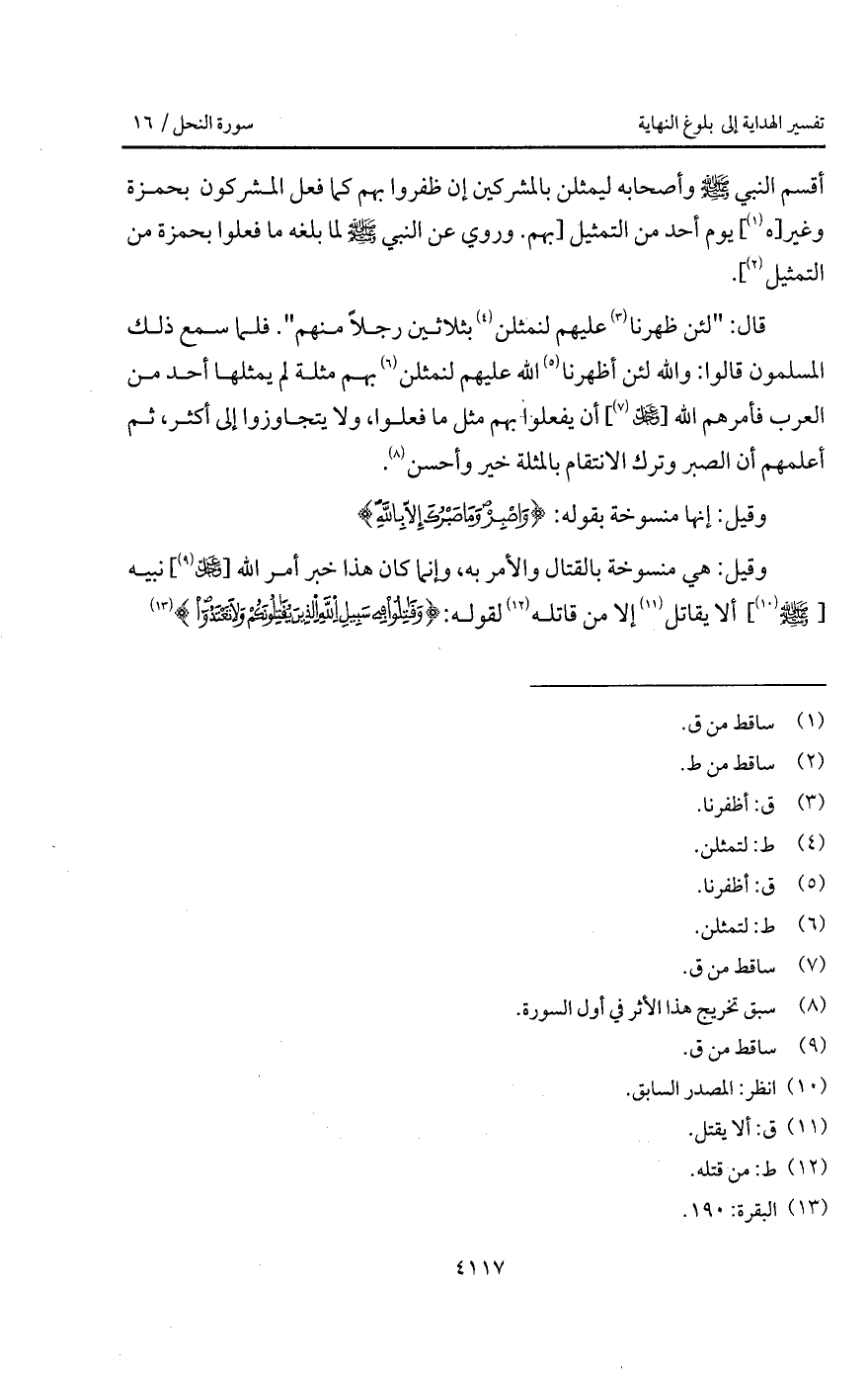 قال: " لئن ظهرنا عليهم لنمثلن بثلاثين رجلاً منهم " فلما سمع ذلك المسلمون قالوا: والله لئن أظهرنا الله عليهم لنمثلن بهم مثلة لم يمثلها أحد من العرب فأمرهم الله [ D] أن يفعلوا بهم مثل ما فعلوا، ولا يتجاوزوا إلى أكثر، ثم أعلمهم أن الصبر وترك الانتقام بالمثلة خير وأحسن.