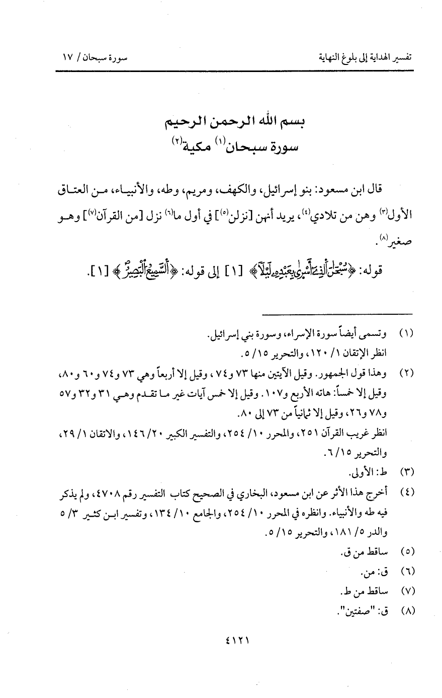 قوله: {سُبْحَانَ الذى أسرى بِعَبْدِهِ لَيْلاً} إلى قوله: {السميع البصير}.