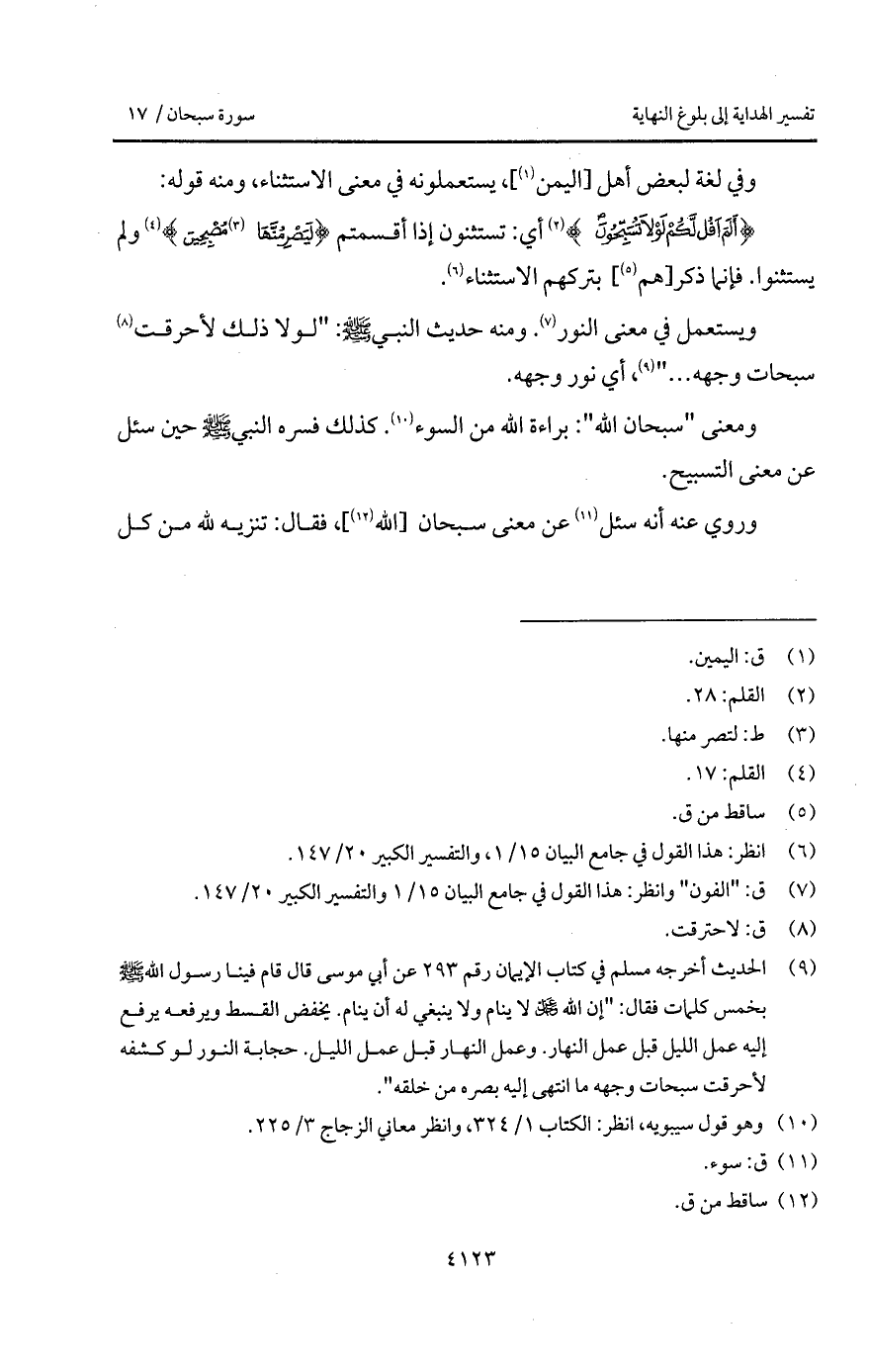 ويستعمل في معنى النور. ومنه حديث النبي A: " لولا ذلك لأحرقت سبحات وجهه. . . "، أي نور وجهه.