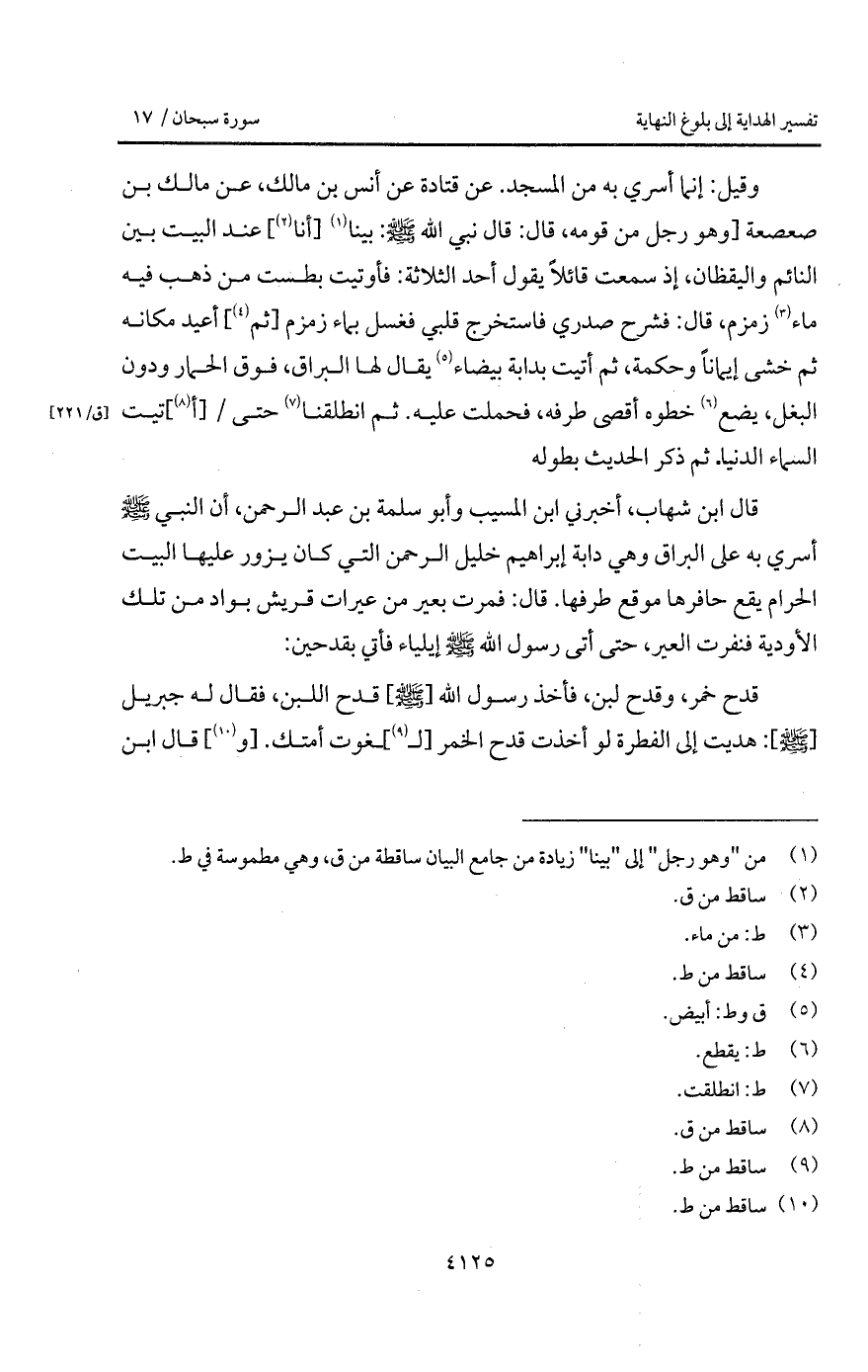 وقيل: إنما أسري به من المسجد. عن قتادة عن أنس بن مالك، عن مالك بن صعصعة [وهو رجل من قومه، قال: قال نبي الله A: " بينا [أنا] عند البيت بين النائم واليقظان، إذ سمعت قائلاً يقول أحد الثلاثة: فأوتيت بطست من ذهب فيه ماء زمزم، قال: فشرح صدري فاستخرج قلبي فغسل بماء زمزم [ثم] أعيد مكانه ثم خشي إيماناً وحكمة، ثم أتيت بداية بيضاء يقال لها البراق، فوق الحمار ودون البغل، يضع خطوه أقصى طرفه، فحملت عليه. ثم انطلقنا حتى / [أ] تيت السماء الدنيا " ثم ذكر الحديث بطوله