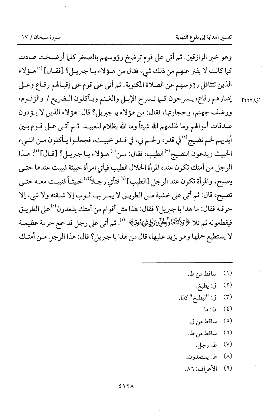 وهو خير الرازقين. ثم أتى على قوم ترضخ رؤوسهم بالصخر كلما أرضخت عادت كما كانت لا يفتر عنهم من ذلك شيء فقال من هؤلاء يا جبريل؟ [فقال] هؤلاء الذين تتثاقل رؤوسهم عن الصلاة المكتوبة. ثم أتى على قوم على إقبالهم رقاع وعلى إدبارهم رقاع، يسرحون كما تسرح الإبل والغنم ويأكلون الضريع / والزقوم، ورضف جهنم، وحجارتها، فقال: من هؤلاء يا جبريل؟ قال: هؤلاء الذين لا يؤدون صدقات أموالهم وما ظلمهم الله شيئاً وما الله بظلام للعبيد. ثم أتى على قوم بين أيديهم لحم نضيج في قدر، ولحم نيء في قدر خبيث، فجعلوا يأكلون من النيء الحبيث ويدعون النضيج الطيب، فقال: من هؤلاء يا جبريل؟ [قال]: هذا الرجل من أمتك تكون عنده المرأة الحلال الطيب فيأتي امرأة خبيثة فيبيت عندها حتى تصبح، والمرأة تكون عند الرجل [الطيب] فتأتي رجلاً خبيثاً فتبيت معه حتى تصبح، قال: ثم أتى على خشبة من الطريق لا يمر بها ثوب إلا شقته ولا شيء إلا حرقته فقال: ما هذا يا جبريل؟ فقال: هذا مثل أقوام من أمتك يقعدون على الطريق فيقطعونه، ثم تلا {وَلاَ تَقْعُدُواْ بِكُلِّ صِرَاطٍ تُوعِدُونَ}. ثم أتى على رجل قد جمع حزمة عظيمة لا يستطيع حملها وهو يزيد عليها، قال من هذا يا جبريل؟ قال: هذا الرجل من أمتك