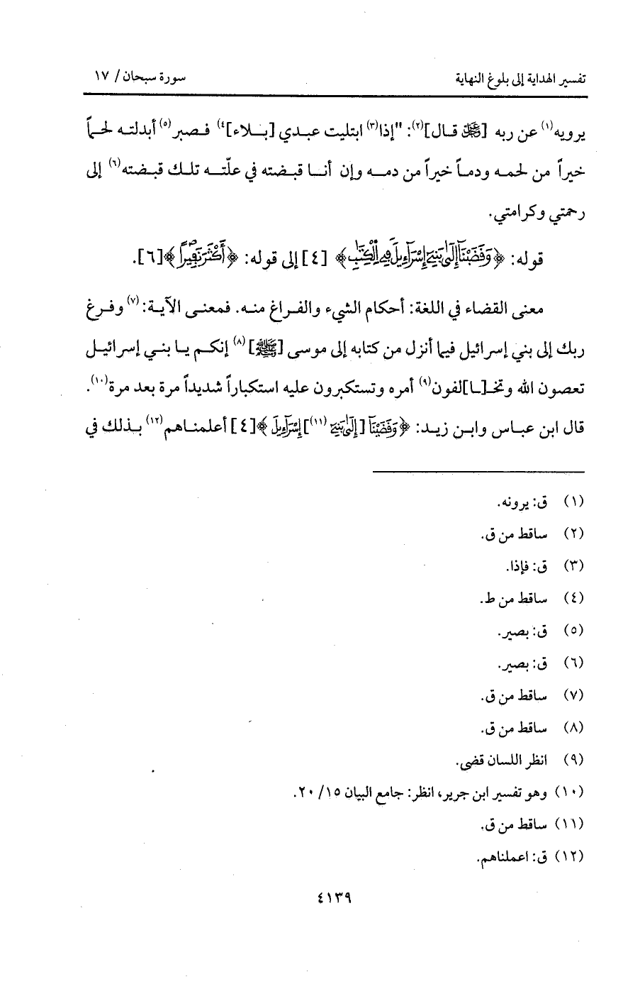 معنى القضاء في اللغة: أحكام الشيء والفراغ منه. فمعنى الآية: وفرغ ربك إلى بني إسرائيل فيما أنزل من كتابه إلى موسى [ A] إنكم يا بني إسرائيل تعصون الله وتخ [ا] لفون أمره وتستكبرون عليه استكباراً شديداً مرة بعد مرة. قال ابن عباس وابن زيد: {وَقَضَيْنَآ [إلى بَنِي] إِسْرَائِيلَ} أعلمناهم بذلك في
