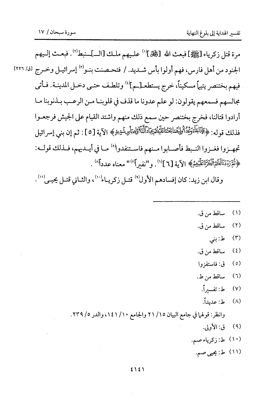 مرة قتل زكرياء [ A] فبعث الله [ D] عليهم ملك [ال] نبط. فبعث إليهم الجمود من أهل فارس، فهم أولوا بأس شديد. / فتحصنت بنو إسرائيل وخرج فيهم بختنصر يتيماً مسكيناً، خرج يستطع [م] وتلطف حتى دخل المدينة. فأتى مجالسهم فسمعهم يقولون: لو علم عدونا ما قذف في قلوبنا من الرعب بذنوبنا ما أرادوا قتالنا، فخرج بختنصر حين سمع ذلك منهم واشتد القيام على الجيش فرجعوا فذلك قوله: {فَإِذَا جَآءَ وَعْدُ أُولاهُمَا بَعَثْنَا عَلَيْكُمْ عِبَاداً لَّنَآ أُوْلِي بَأْسٍ شَدِيدٍ} الآية: ثم إن بني إسرائيل تجهزوا فغزوا النبط فأصابوا منهم فاستنفذوا ما في أيديهم، فذلك قوله: {ثُمَّ رَدَدْنَا لَكُمُ الكرة عَلَيْهِمْ} الآية. و " نفيراً " معناه عدداً.
