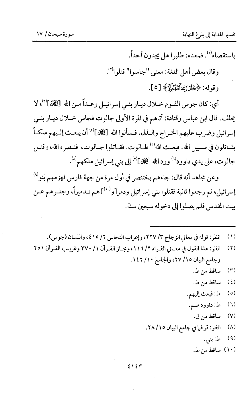 وعن مجاهد أنه قال: جاءهم بختنصر في أول مرة من جهة فارس فهزمهم بنو إسرائيل، ثم رجعوا ثانية فقتلوا بني إسرائيل ودمر [و] هم تدميراً، وجلوهم عن بيت المقدس فلم يصلوا إلى دخوله سبعين سنة.