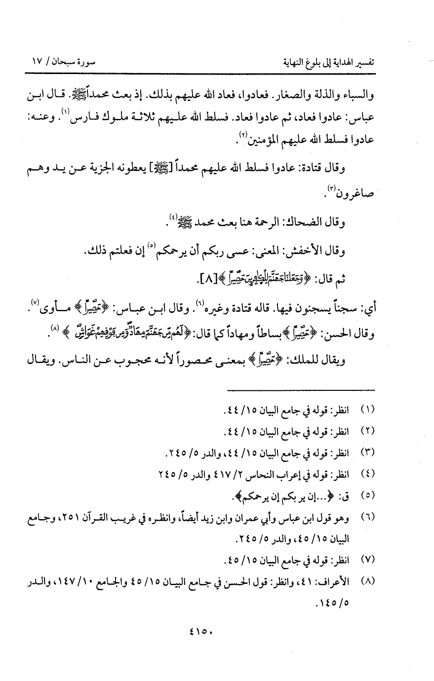 والسباء والذلة والصغار. فعادوا، فعاد الله عليهم بذلك. إذ بعث محمداً. قال ابن عباس: عادوا فعاد، ثم عادوا فعاد. فسلط الله عليهم ثلاثة ملوك فارس. وعنه: عادوا فسلط الله عليهم المؤمنين.