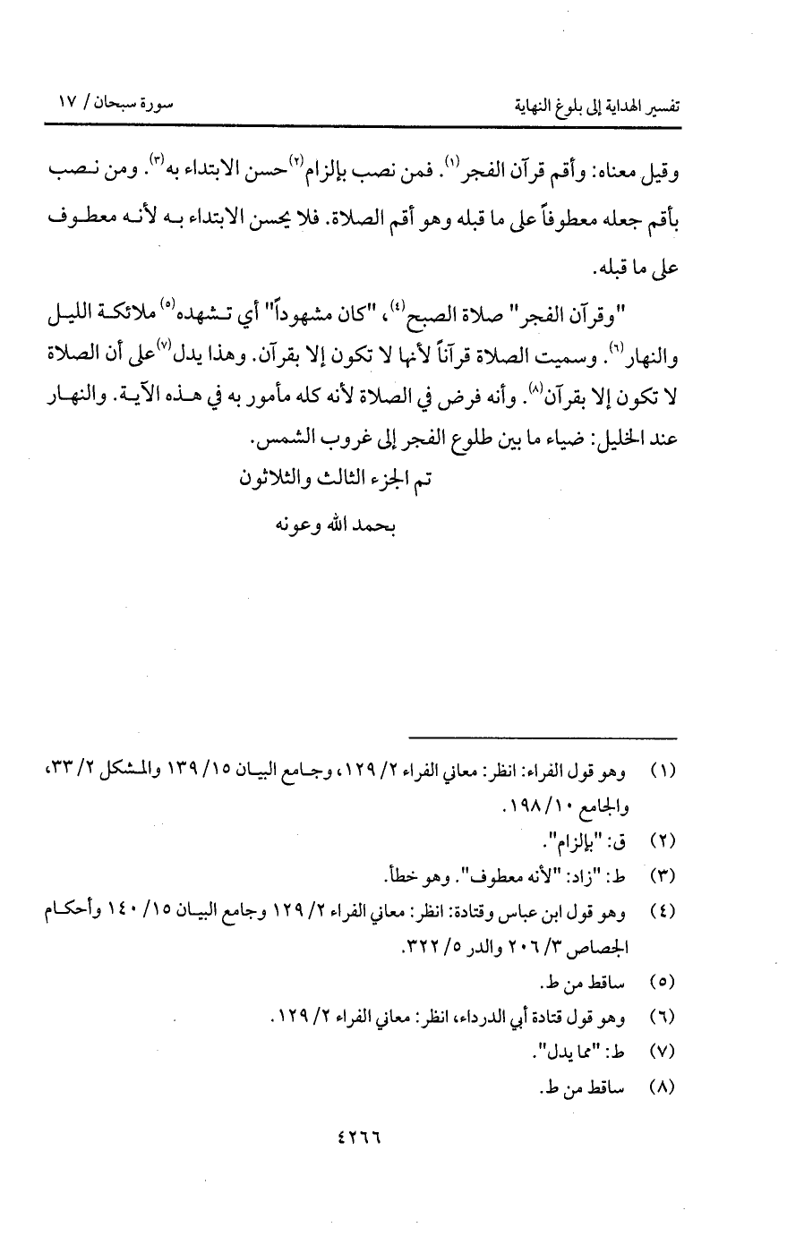 وقيل معناه: وأقم قرآن الفجر. فمن نصب بإلزام حسن الابتداء به. ومن نصب بأقم جعله معطوفاً على ما قبله وهو أقم الصلاة. فلا يحسن الابتداء به لأنه معطوف على ما قبله.