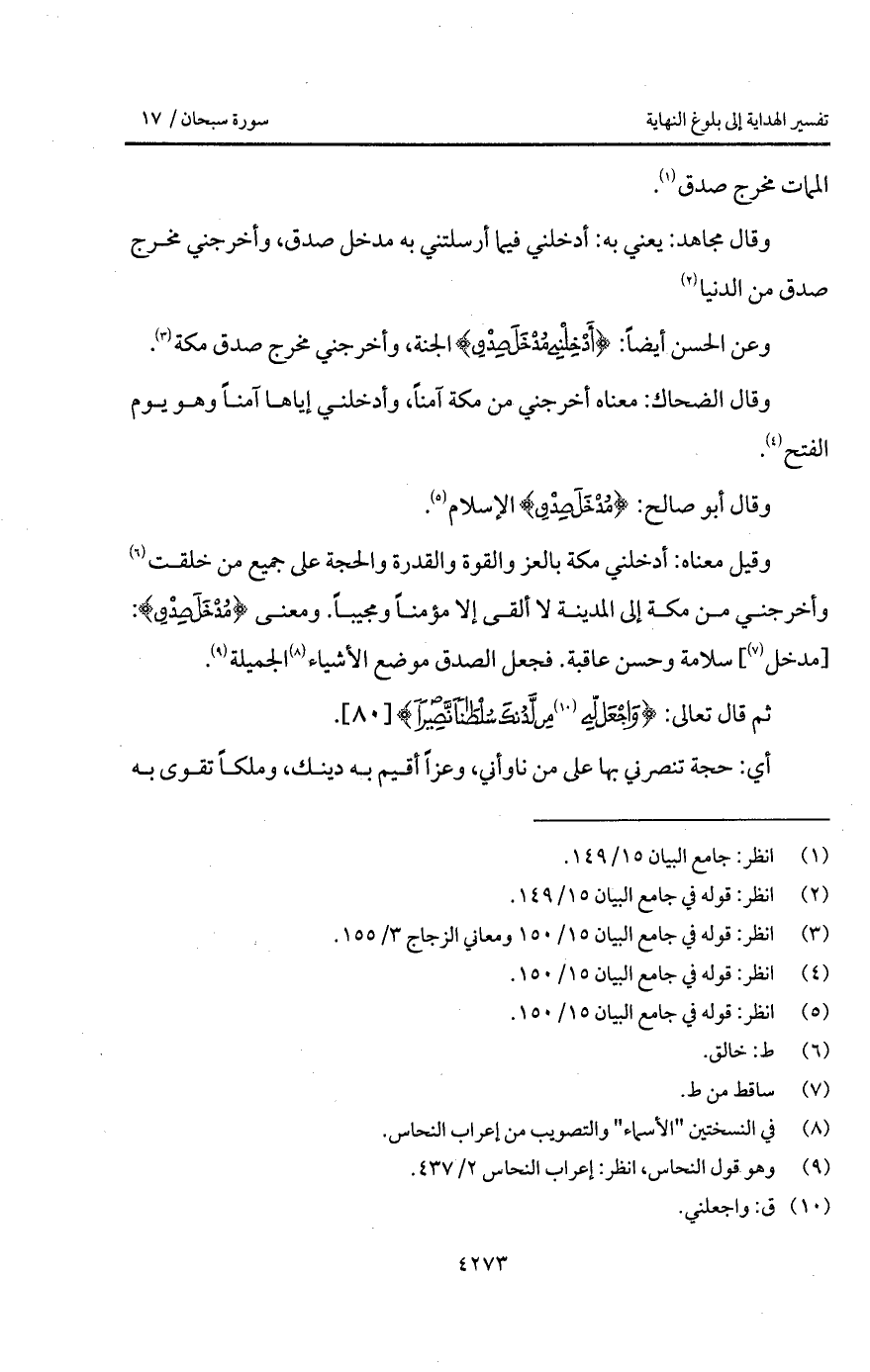 وقيل معناه: أدخلني مكة بالعز والقوة والقدرة والحجة على جميع من خلقت وأخرجني من مكة إلى المدينة لا ألقى إلا مؤمناً ومجيباً. ومعنى {مُدْخَلَ صِدْقٍ}: [مدخل] سلامة وحسن عاقبة. فجعل الصدق موضع الأشياء الجميلة.