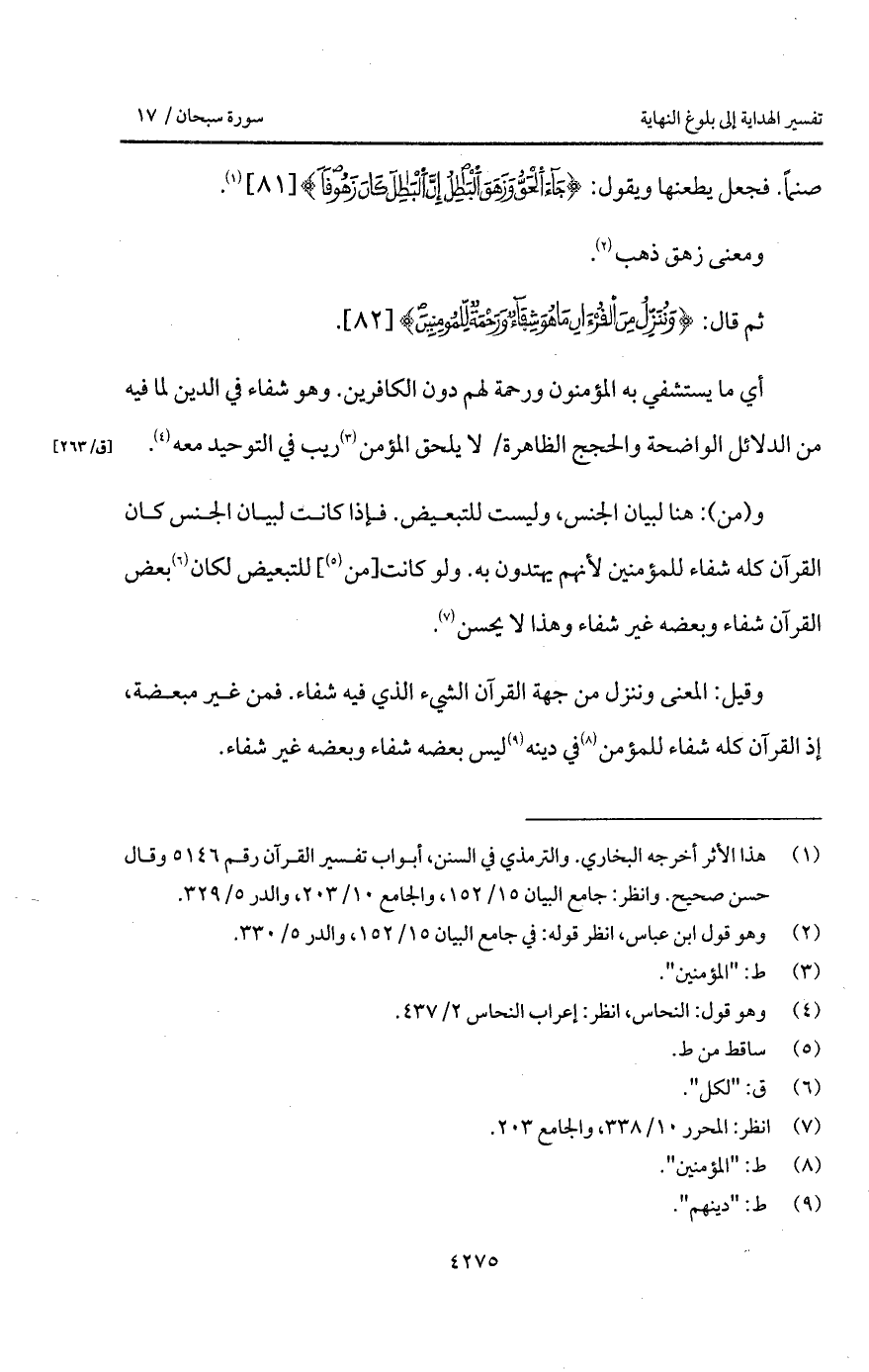 و (من): هنا لبيان الجنس، وليست للتبعيض. فإذا كانت لبيان الجنس كان القرآن كله شفاء للمؤمنين لأنهم يهتدون به. ولو كانت [من] للتبعيض لكان بعض القرآن شفاء وبعضه غير شفاء وهذا لا يحسن.